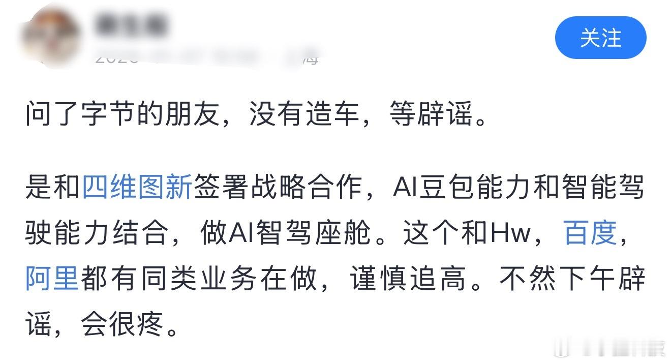 都在传字节跳动要造车,这是AI眼镜、AI手机、AI汽车,所有流量入口都想抢占的节奏?合作车企可能是赛力斯旗下的蓝电,以方便出海。不过也有人问过字节员工,并没有造车,而是和四维图新联合做AI智能座舱。