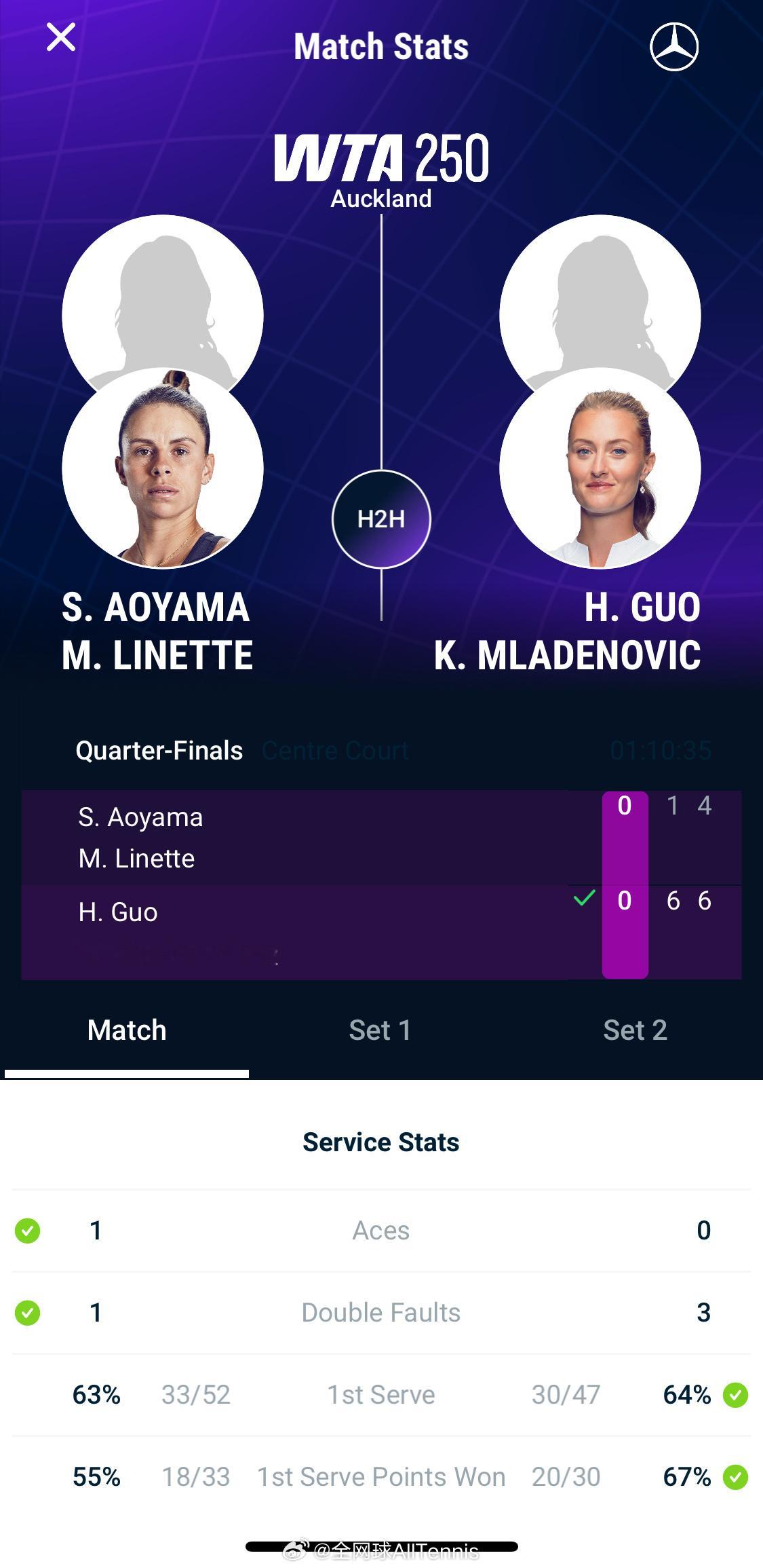 WTA250奥克兰站,中国金花郭涵煜搭档法国选手梅拉德诺维奇6-1/6-4战胜青山修子/里内特,晋级女双四强🔥澳网2026体育大赏网球