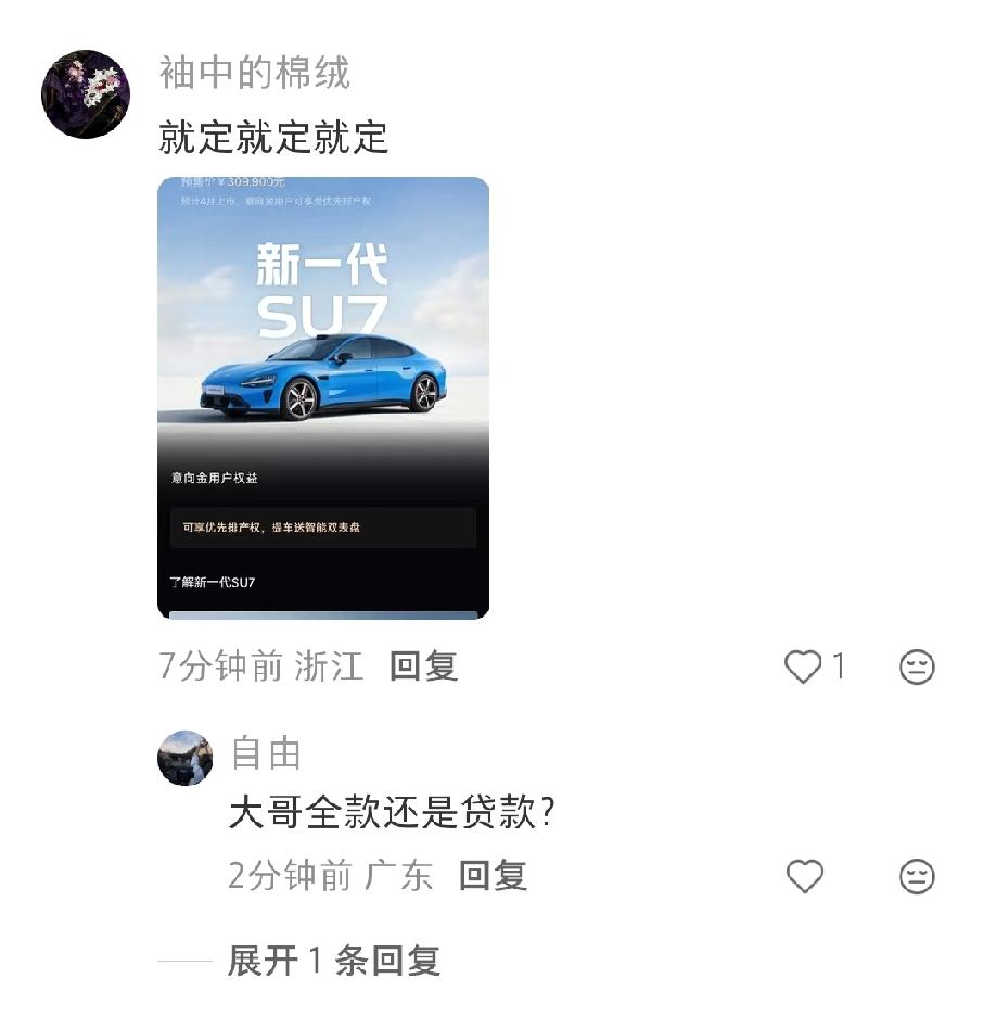 雷总今晚又要直播了,主要是跟大家聊聊改款su7,顺带着回应一下网上的质疑。比如说跟相关kol接触这个事情他本人事先到底知不知情? 今天小米新一代su7开启小定后,网上已经有不少米粉晒出了下定的单子。看来小米汽车受众群体或者说小米产品的基本盘还是非常庞大的,这些意向消费者丝毫没有受到这一年来网上这么多负面消息的影响。 大家看看这次小米新一代su7最后小定能有多少数量?我猜这个数字又会让大家大吃一惊!