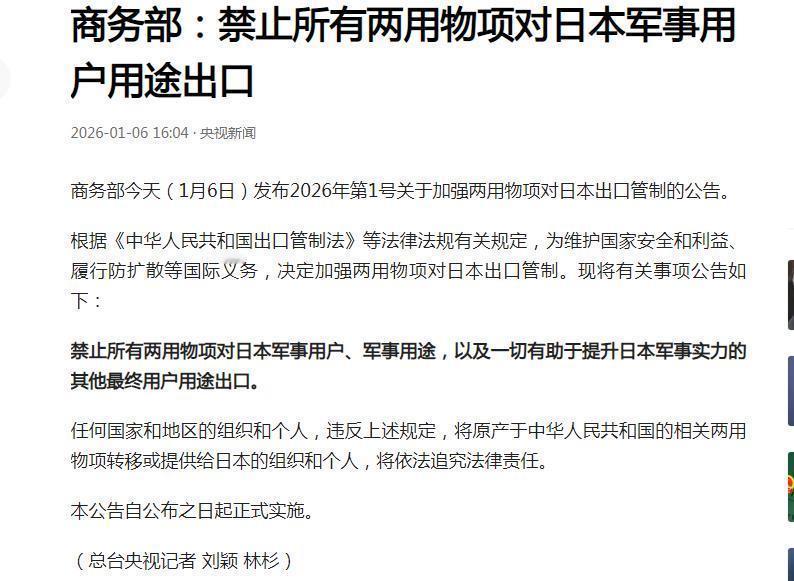 中国对日禁令威力有多猛?重稀土依存 99%,日本 GDP 或降 0.43%,韩国成关键棋子 中国突然对日本祭出两用物项出口禁令,这招 “阳谋” 威力到底有多大? 日本的产业结构有个 “致命点”——军民企业界限模糊,所有涉军产能都由民用企业承担。中国此次禁令直接覆盖日本所有企业,意味着其军工和高端制造产业链将被 “精准锁喉”。 在关键资源上,日本对中国依赖到了 “命脉级”:重稀土依存度 99%,碳纤维等关键材料也极度依赖中国供应。有日本专家测算,仅金属类禁令就可能让日本年 GDP 下降2.6 万亿日元,整体 GDP 跌幅达0.43%。要是把碳纤维等领域算进去,影响只会更剧烈。 更妙的是中国的 “布局”—— 在对韩国全面开放经贸合作的同时,对日本收紧闸门。韩国同样依赖中国99% 的碳纤维和90% 以上的稀土,但中韩经贸全面回暖,这让韩国成了中日博弈间的 “关键传话人”。 日本现在是真急了!其通商白皮书显示,国内 4300 多种商品里,1400 多种依赖进口,一半核心来源是中国,从生活食品到工业原料,依赖度深到骨子里。中国这招,连特朗普都扛不住,日本接下来是硬刚还是服软?咱们拭目以待!