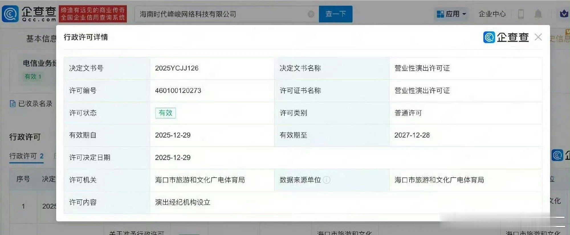 海南时代峰峻新增了演出许可证我特么惶恐啊
