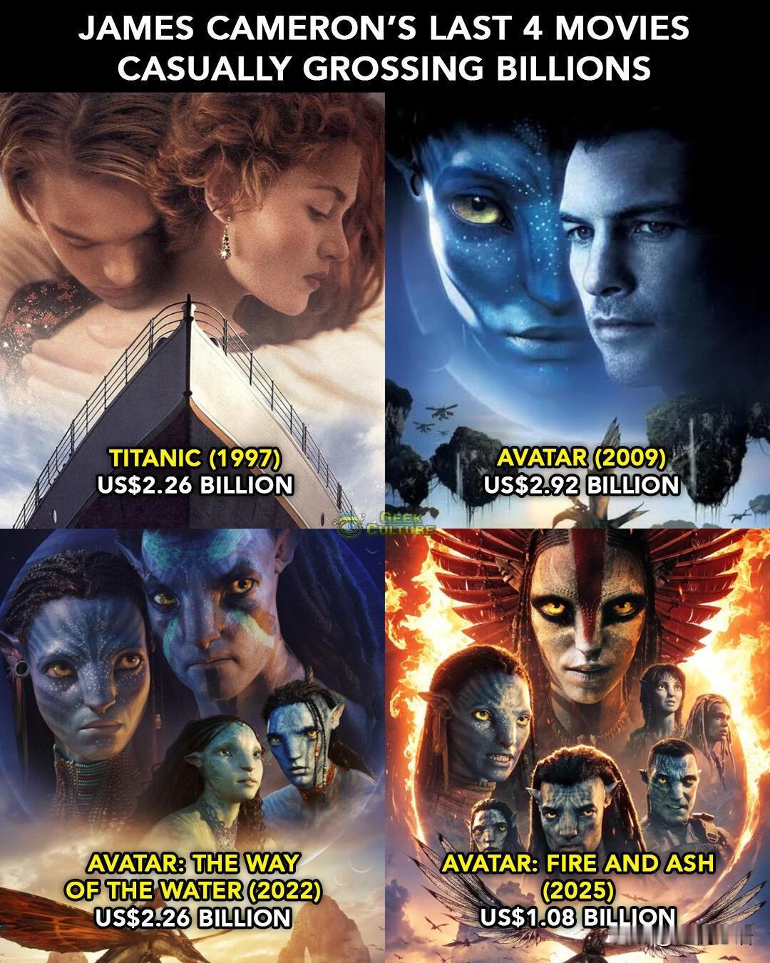 卡梅隆也太牛了吧! 唯一有有四部作品破10亿美金的导演 影史独一份的存在! 从《泰坦尼克号》的旷世爱情, 到《阿凡达》系列的奇幻世界, 每部都让人眼前一亮。 不跟风流量, 沉下心打磨作品, 这才是真导演该有的样子啊! 没有套路化剧情, 全是实打实的视觉震撼和情感共鸣, 看完只想二刷三刷。 这样的神仙导演, 真的可以永远相信他的作品!