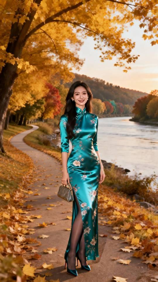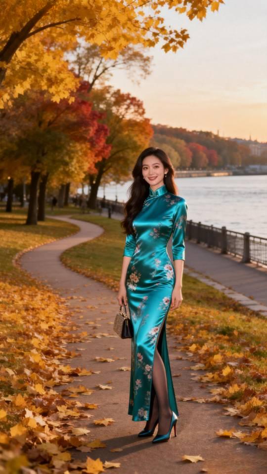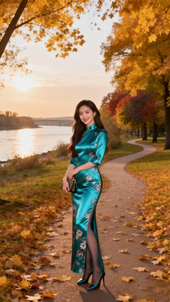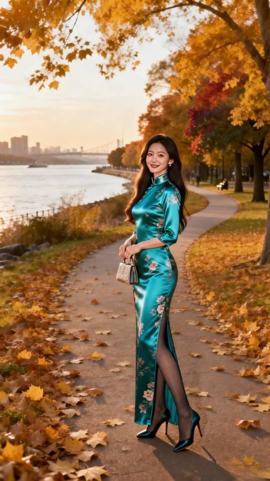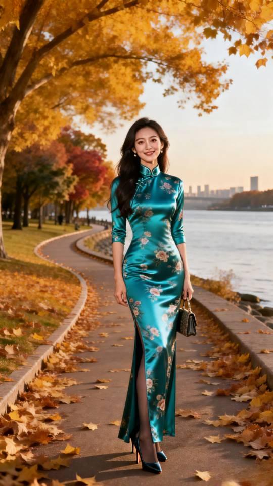 秋天来了,优雅的蓝旗袍女子河边漫步摆拍,金色落叶相伴,尽显时尚与自然之美。旗袍 旗袍美女 旗袍秋景