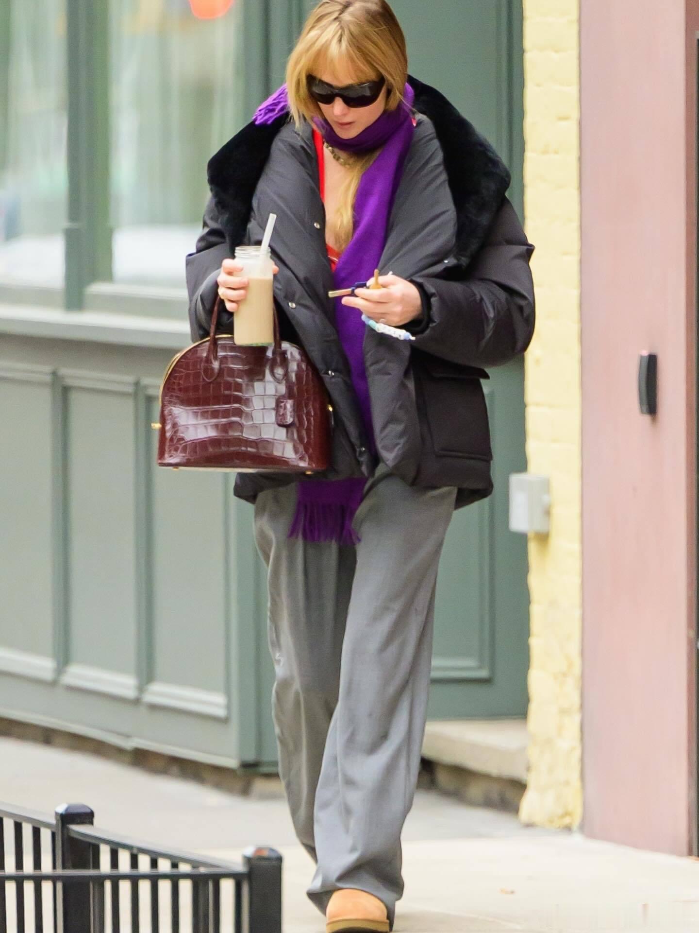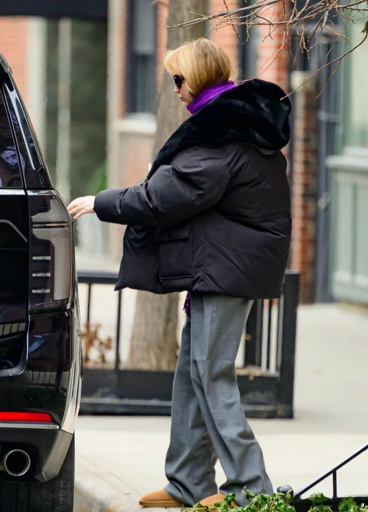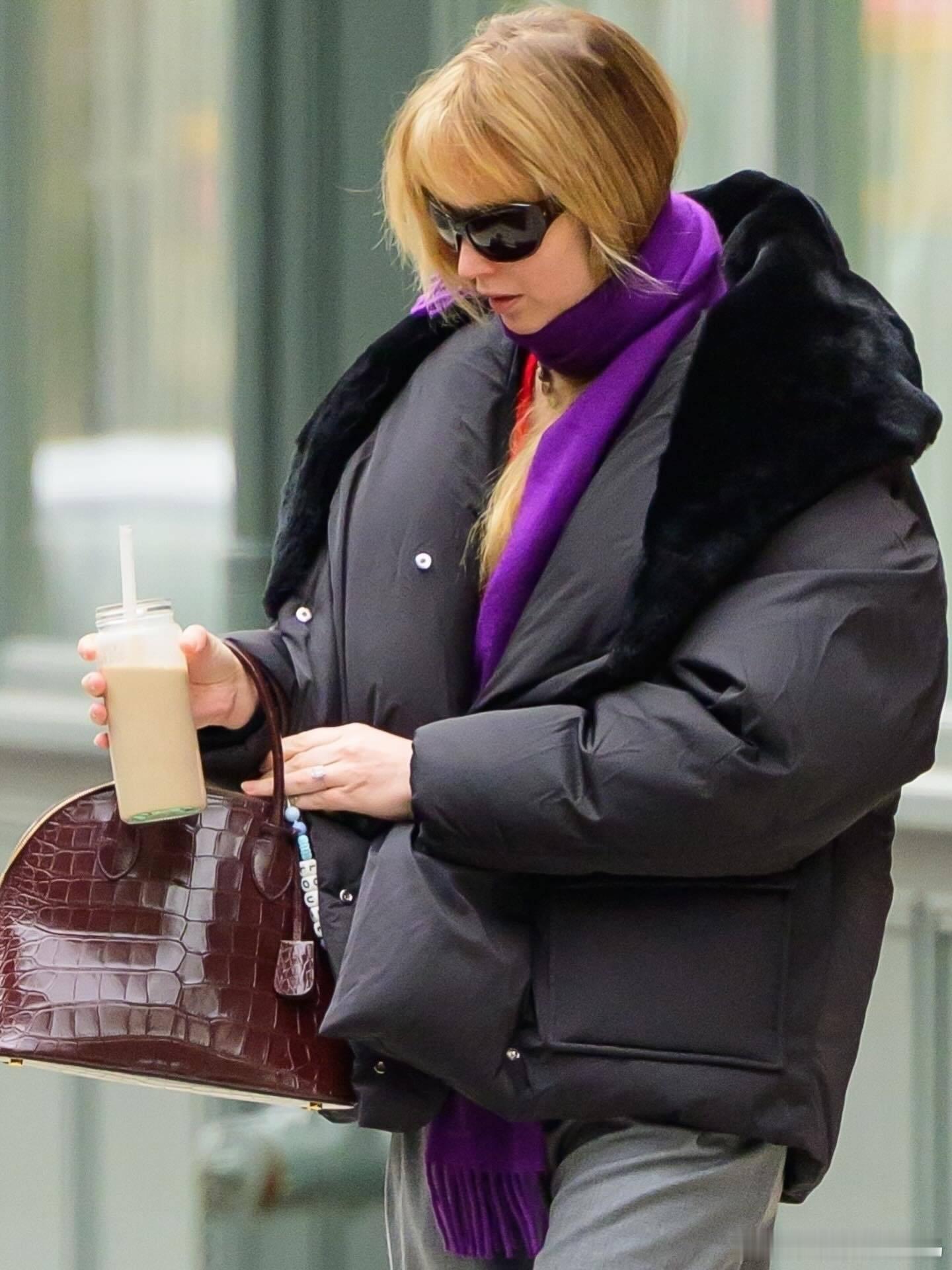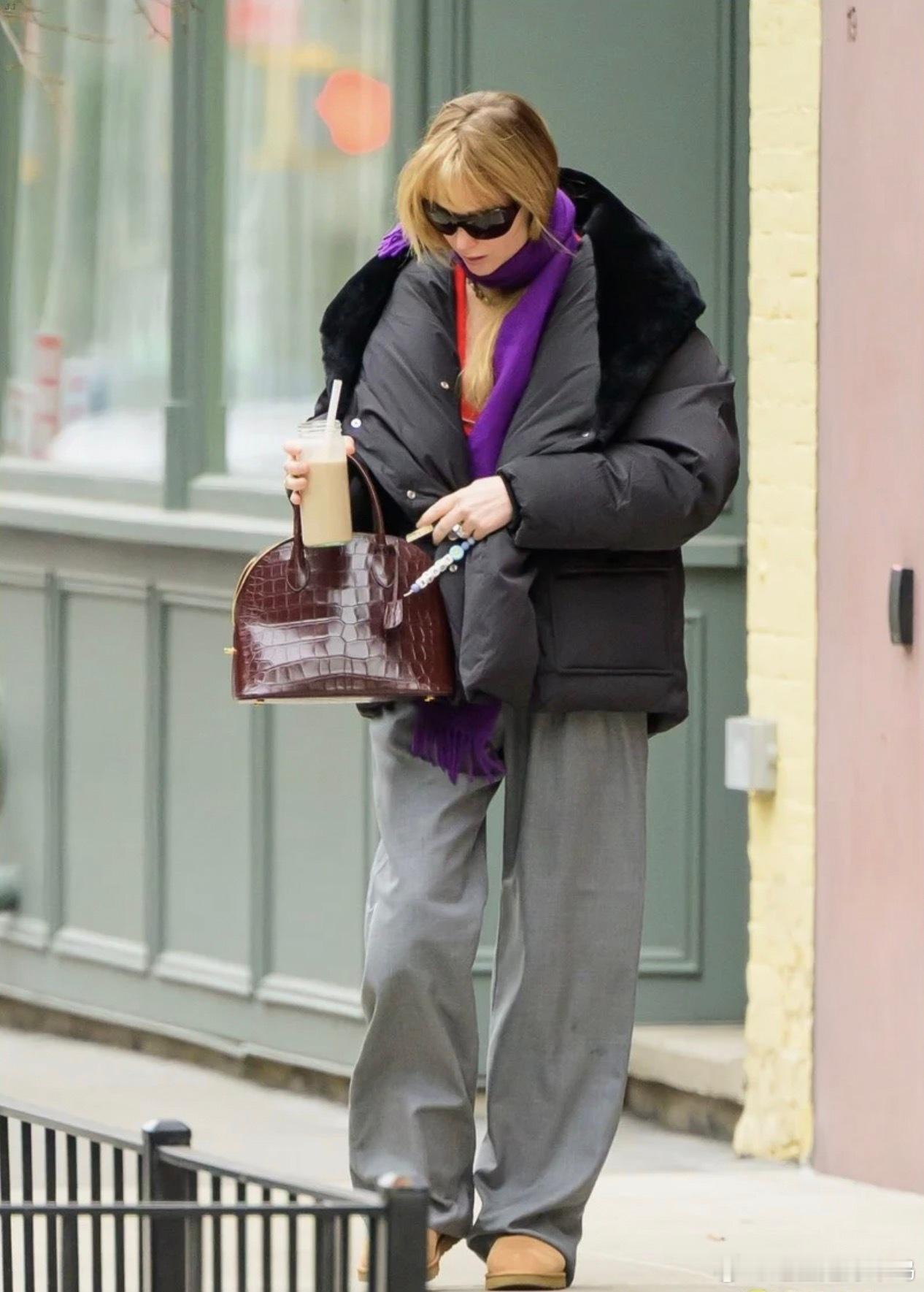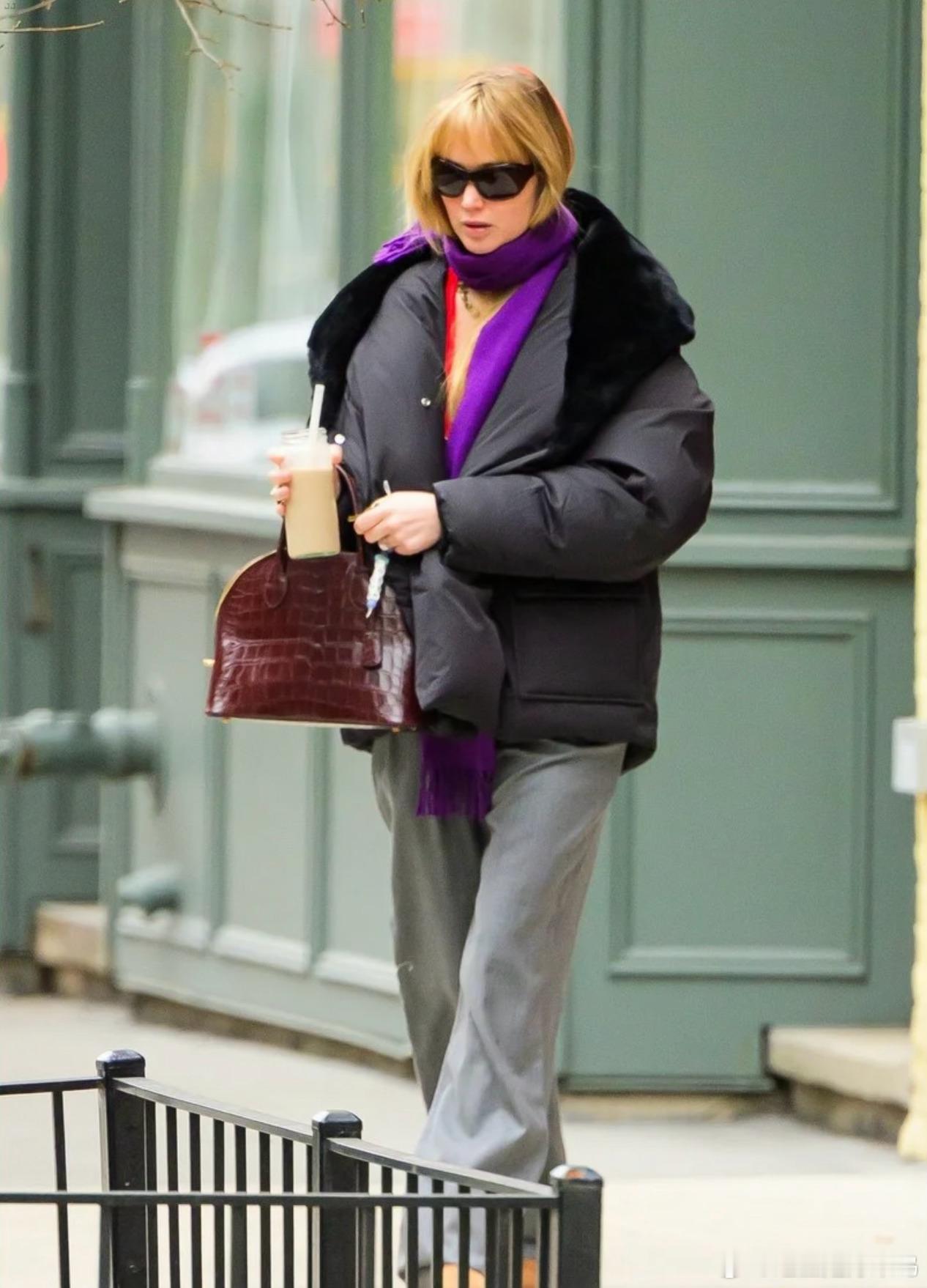 詹妮弗·劳伦斯jennifer lawrence 当地时间1月5日,“大表姐”詹妮弗·劳伦斯(Jennifer Lawrence)现身纽约街头,在外出时,她身着一件黑色羽绒服、戴了一条紫色围巾,搭配宽松的灰色阔腿裤和一双雪地靴,还戴了副太阳镜,拎着一个酒红色的手提包作为配饰。手里拿着一杯似乎是咖啡的饮品,她的钥匙链上挂着一个写着“LOUIS”名字的挂件,据了解这是她第二个儿子的名字(但尚未得到证实)。