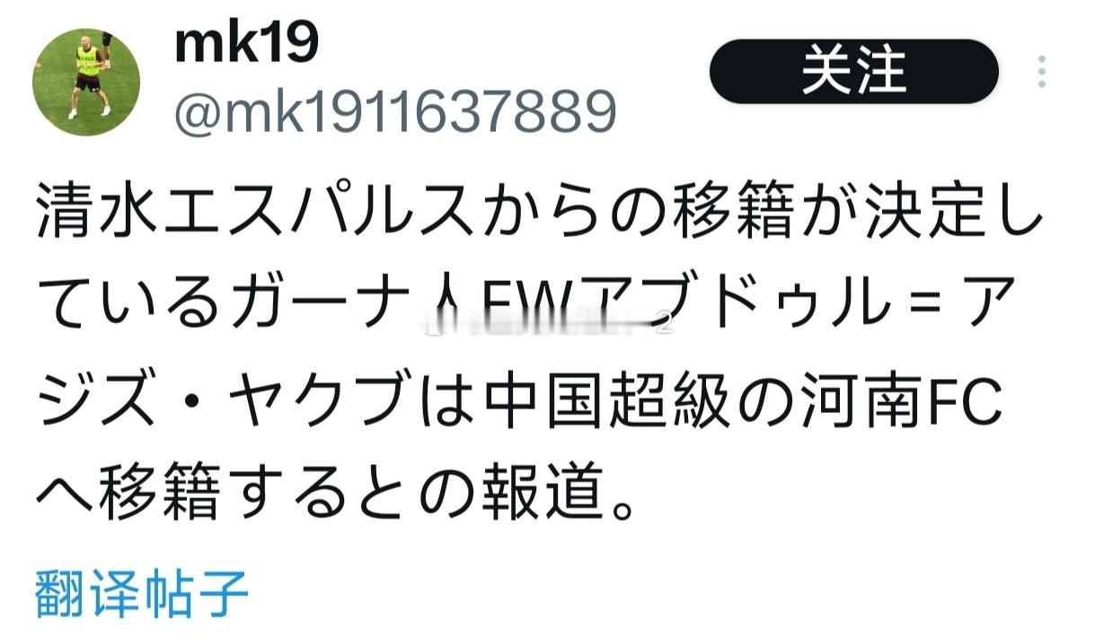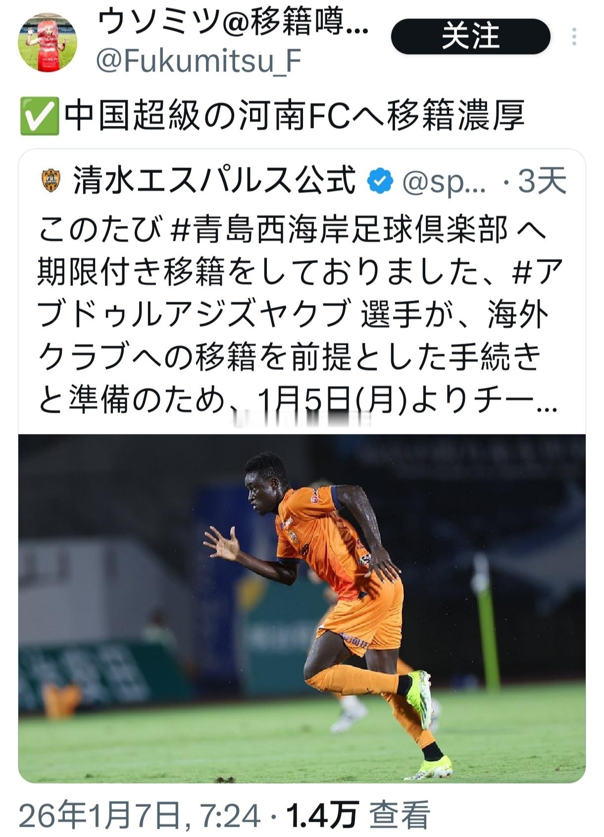 快讯!据日本媒体报道,日本J联赛球队清水心跳俱乐部球员阿卜杜勒阿齐兹亚库布新赛季将加盟中超球队河南FC阿齐兹来自 加纳现年27岁身高1米87,司职中锋,曾效力于中超武汉三镇队,上赛季被清水心跳租借中超青岛西海岸队,2026年清水心跳跟河南FC达成一致球员将转会河南俱乐部,值得一提的是,球员的合同将在1月份到期