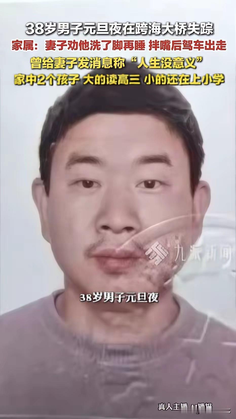 福建石狮,一38岁男子外出回家后,妻子劝他洗一个脚再睡,本来只是很寻常的一句话,可没想到男子竟然和妻子发生了争执,然后转身就摔门离开了家,妻子以为他就是心情不好出去透透气,也就没在意,可谁知,当晚男子给妻子发了一条“人生没意义”的消息后,就没了踪影。 妻子说丈夫进门时脸色就不太好看,身上还带着点酒气,估计是在外头应酬受了气。她随口提了句洗脚,也是心疼他奔波一天累得慌。丈夫当时就拔高了嗓门,说她管得宽,嫌她唠叨,吵了几句就摔门走了。 38岁的男人,正是上有老下有小的年纪,肩上扛着房贷车贷,顶着养家糊口的压力。在外头,得陪着笑脸应付客户和老板,回到家,连句关心的话都听不进去。他摔门而去的那一刻,心里憋着的恐怕不只是对妻子的不满吧。还有重重地压力。 妻子没当回事也能理解,谁家过日子没点磕磕绊绊?她总觉得男人出去转一圈,抽根烟冷静冷静就回来了。那条“人生没意义”的消息,竟然会是丈夫留给她的最后一句话。 夫妻俩拌嘴斗气太很正常的。家属后来报警,警方调了监控,看到男子独自在河边徘徊了很久,身影孤单得让人心疼。 这事儿传到网上,不少人说男人太冲动,说他不负责任,丢下老婆孩子不管不顾。可我总觉得,压垮成年人的从来不是最后一根稻草,而是日积月累的疲惫和委屈。 我们总说成年人要坚强,要扛住所有压力,却很少有人问一句,你累不累。男子不是不想扛,而是真的扛不动了。 夫妻之间,有时候一句关心的话,换个语气说出来效果就不一样。妻子要是能察觉到丈夫的低落,换句软话安慰两句,说不定就没这事儿了。男人要是能把心里的憋屈说出来,而不是闷在肚子里。 生活从来都不容易,可再难也不该用消失的方式逃避。人走了,留下的是一辈子的伤痛和遗憾,爱你的人该怎么熬下去? 各位读者你们怎么看?欢迎在评论区讨论。