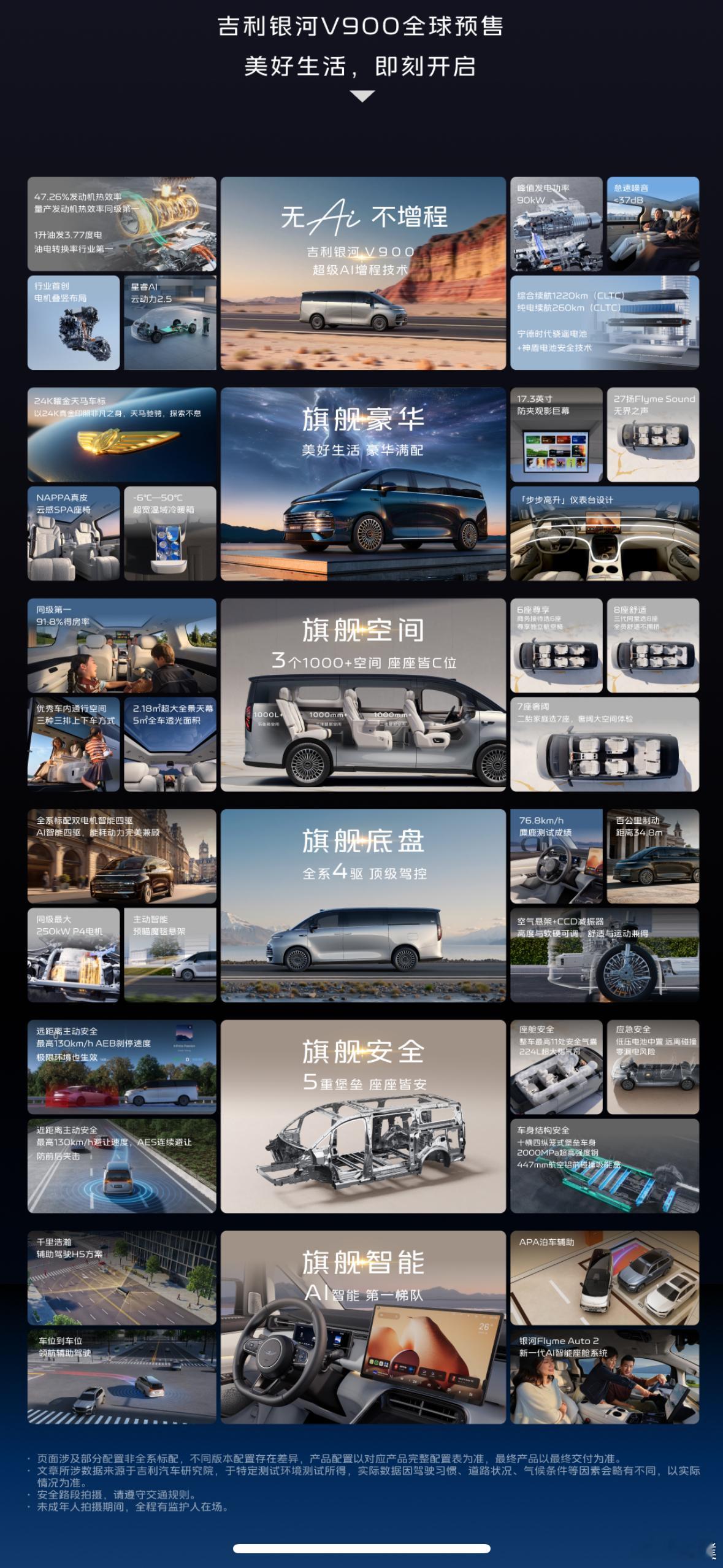 吉利银河首款旗舰MPV银河V900开启预售,共有3个版本,预售价31.98万起,这价格有没有竞争力?新车基于基于GEA Evo架构打造,车身尺寸5360/1998/1920mm,轴距3200mm,得房率91.8%。新车提供6/7/8座三种布局,其中二三排纵向空间均超1000mm,后备箱空间超1000L。智能化方面,车机搭载高通骁龙8295P芯片,采用Flyme Auto 2.0系统,集成DeepSeek及星睿AI大模型,智能驾驶辅助将千里浩瀚辅助驾驶H5方案。动力方面,搭载吉利超级AI增程系统,配合星睿AI云动力2.0,CLTC纯电续航里程260km,综合续航1220km。吉利银河V900预售价31.98万元起
