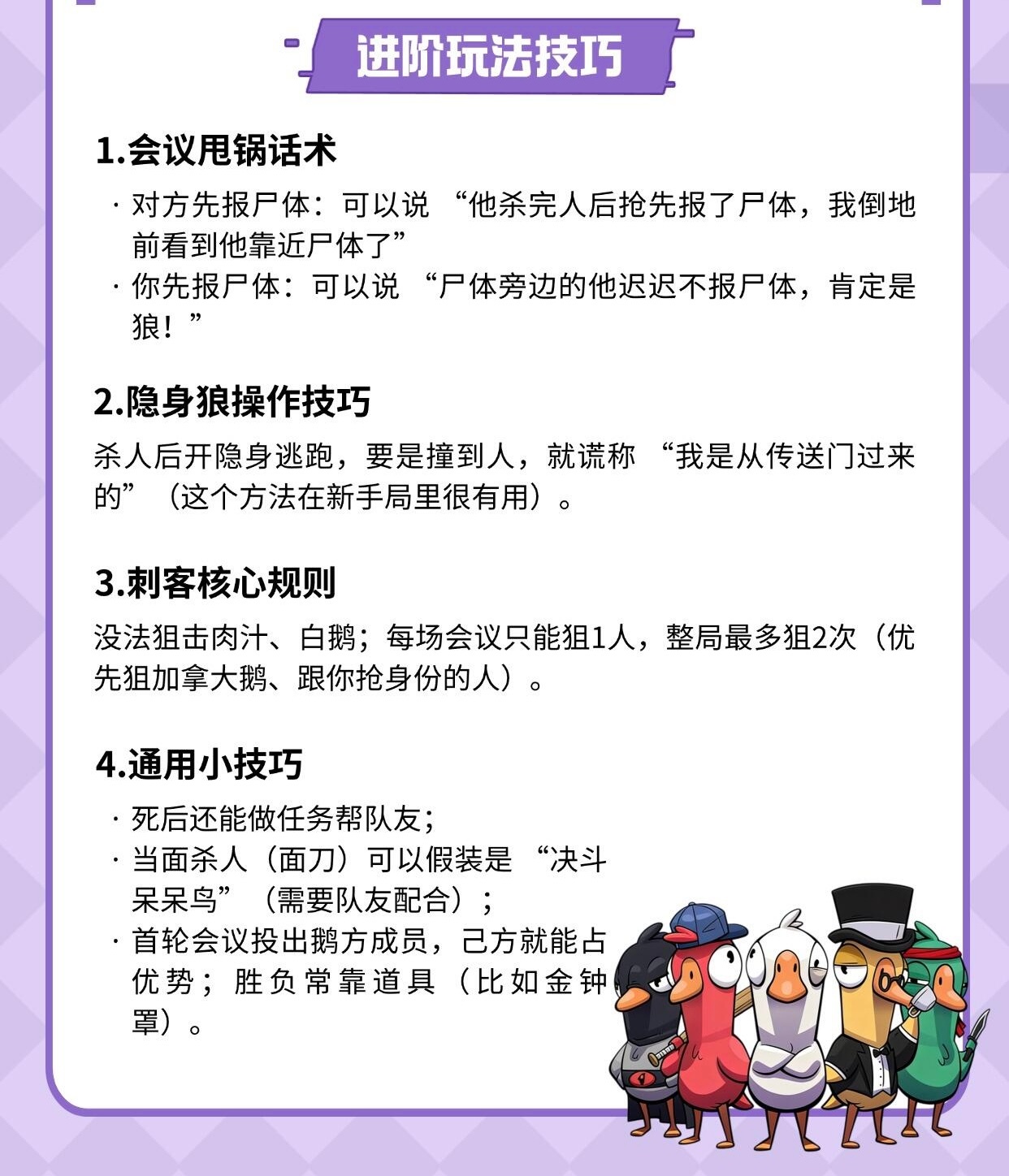 鹅鸭杀新手嘴笨必看指南!这些话千万别乱讲踩雷发言:投票别喊 “咋投不了票”—— 鹅鹅本没投票权,说这等于认鹅鹅;别问 “名旁钱袋是啥”—— 只有鸭能看见肉汁标识,问就爆自己是鸭;别问 “网红死没”—— 鹅死网红有提示,问等于说 “我不是鹅”;别讲 “我拿了铃铛”—— 这任务只有鸭能做,说就直接露馅。进阶话术:对方先报尸:“他杀完抢着报尸,我倒地前见他靠尸体”隐身狼撞人:“我刚从传送门过来的”刺客优先狙:加拿大鹅 / 抢你身份的人学会直接骗哭队友baolan玩鹅鸭杀说好人不配赢鹅鸭杀抢昵称