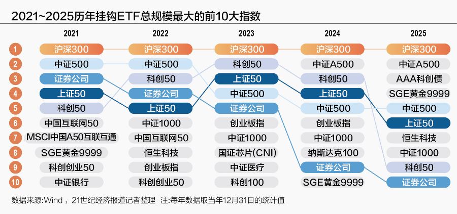 哪些指数是被动投资界的“顶流”?纵观过去五年,ETF市场呈现出“核心宽基指数地位稳固,细分赛道与创新主题轮动活跃”的显著特征,反映了投资者结构、市场热点和政策导向的深刻变化。