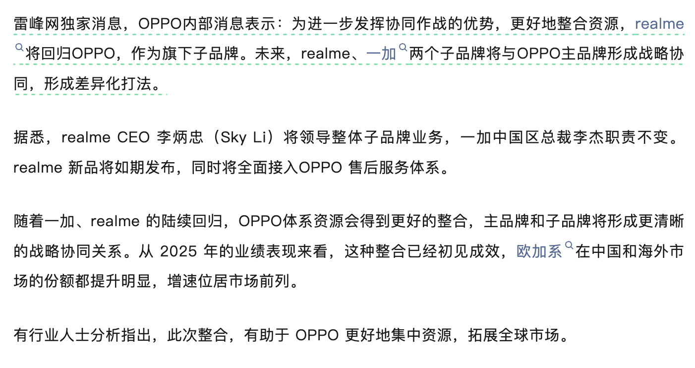 前些天就有网传的消息,这会看来,是真的,realme手机将回归OPPO 。资源的整合,回归之后realme也会重新接入OPPO的售后服务体系。不知道算不算冷知识,之前有一段时间realme也是在O的服务体系里面的,不过没多久还是作为独立运营。不过这会回归的话,对于realme来说售后服务体系又重新有优势了,挺好。之前realme被不少人担忧的一点是售后渠道的地方,这样就又完美解决了。现在整个的行业都很卷,作为整体去运营,资源利用更好一些。主品牌和子品牌也需要更清晰的战略协同,同时这一步应该也是为了更好应对全球市场。只是不知道,这样的一来接下去两个子品牌,会有怎样的分工。斗胆猜测一下,OPPO整体努力向上冲击高端市场,一加负责性能方向猛攻,realme负责在大众普及的影像路线,继续是越级方向,将一些更超前的技术做市场的试探和普及?这样一来,各自之间也不会有冲突,同时也是更加细分面向人群的打法。