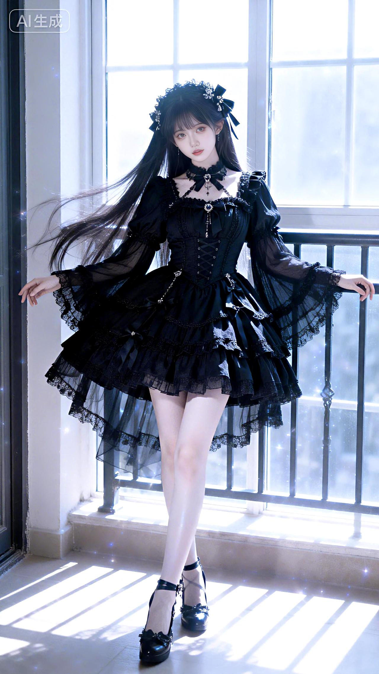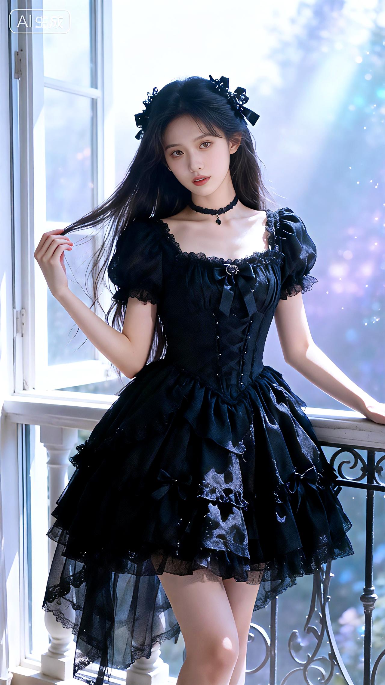 在阳台窗边,穿着黑色洛丽塔裙,梦幻氛围中长发轻扬!黑裙卷发 洛丽塔逆光照 写真 豆包 壁纸