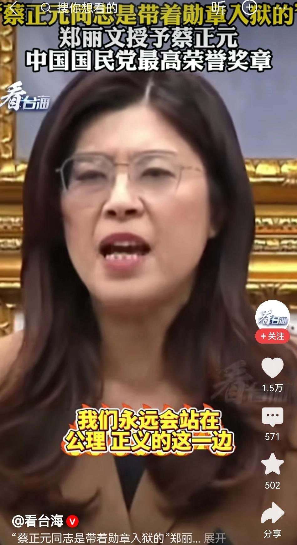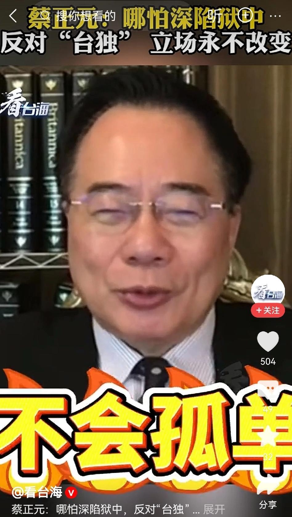 永远站在公理正义的这一边 反对“台独”立场永不改变 蔡正元,您不会孤单! 这次入狱,是您的终身勋章 他日出狱,两岸同胞寄予厚望 宝岛归家,需要您的担当 两岸携手,丽文正元当自强! ————致敬蔡正元先生
