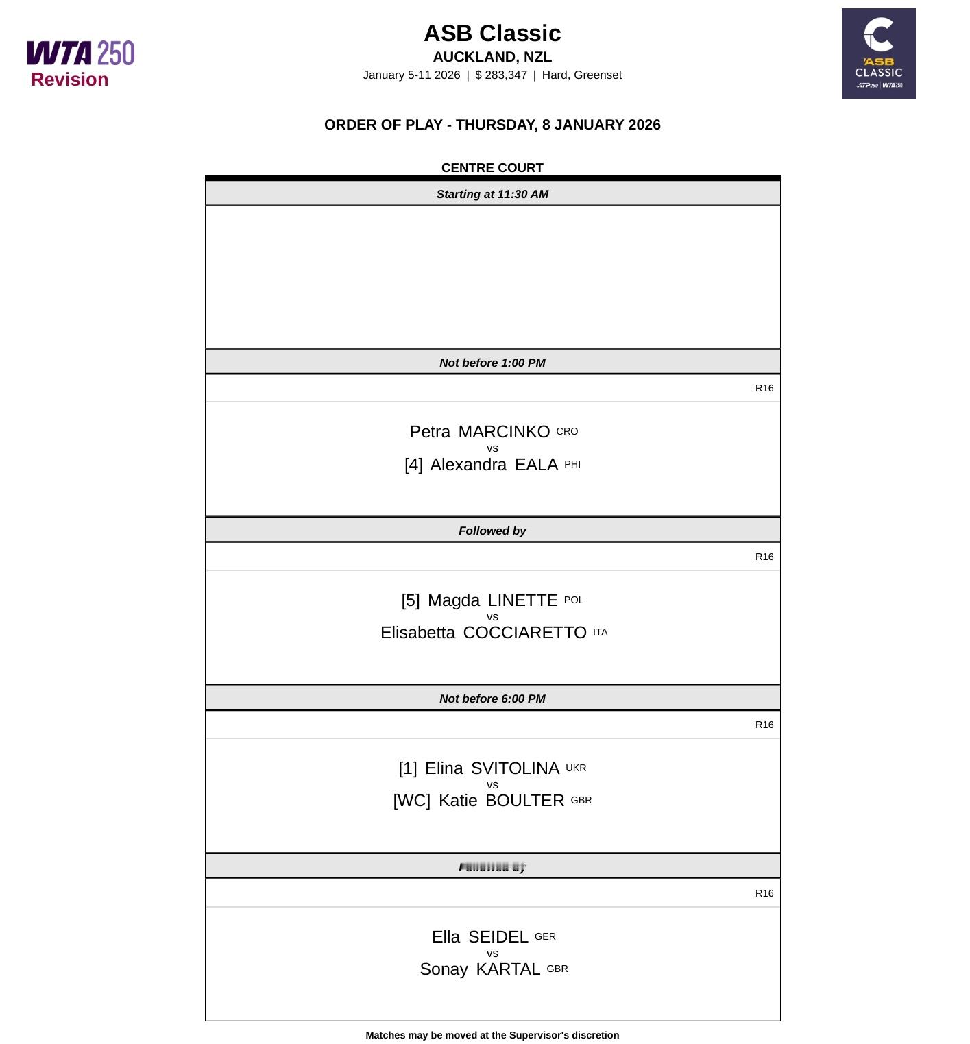周四赛程📅布里斯班站第三轮开打,七位TOP10球员悉数亮相;奥克兰站斯维托丽娜、伊埃拉出战。以下安排均为北京时间👇🎾WTA500布里斯班站📍帕特·拉夫特球场9:00 - 萨巴伦卡 vs 科斯蒂亚随后 - 莱巴金娜 vs [15]巴多萨不早于18:00 - [16]科斯秋克 vs 阿尼西莫娃📍1号场不早于12:30 - [12]施耐德 vs 凯斯随后 - 雅斯特雷姆斯卡 vs 佩古拉随后 - 米拉·安德列娃 vs 诺斯科娃📍2号场不早于10:30 - [11]穆霍娃 vs 亚历山德洛娃随后 - [Q]萨斯诺维奇 vs [10]萨姆索诺娃🎾WTA250奥克兰站📍中心场不早于8:00 - 马辛科 vs 伊埃拉随后 - 里内特 vs 科恰雷托不早于13:00 - 斯维托丽娜 vs [W]博尔特随后 - 赛德尔 vs 卡塔尔