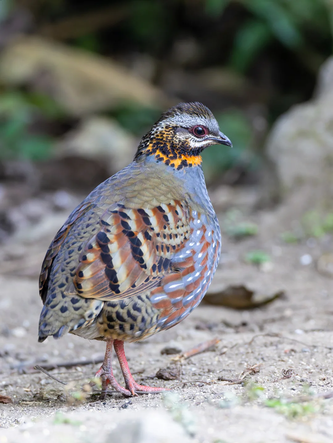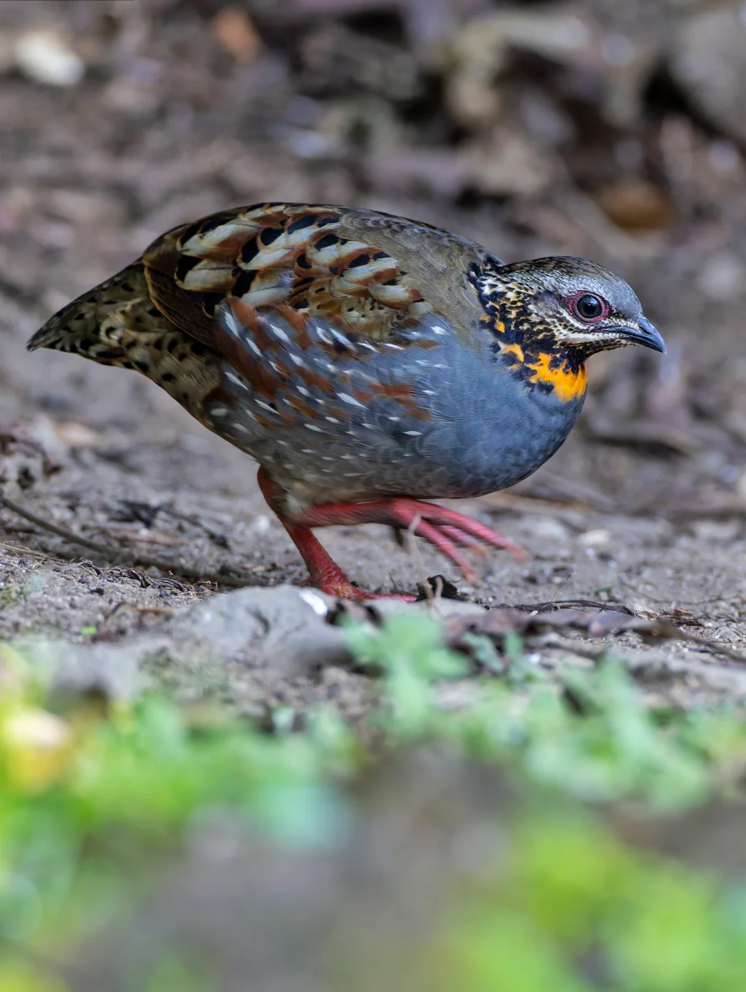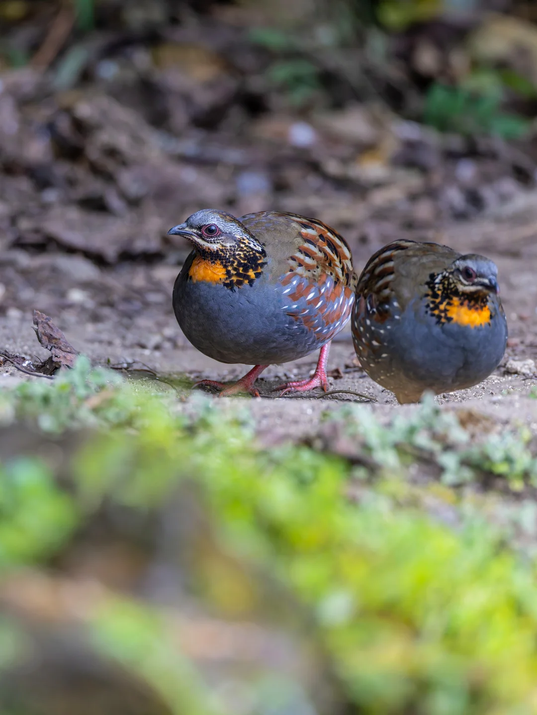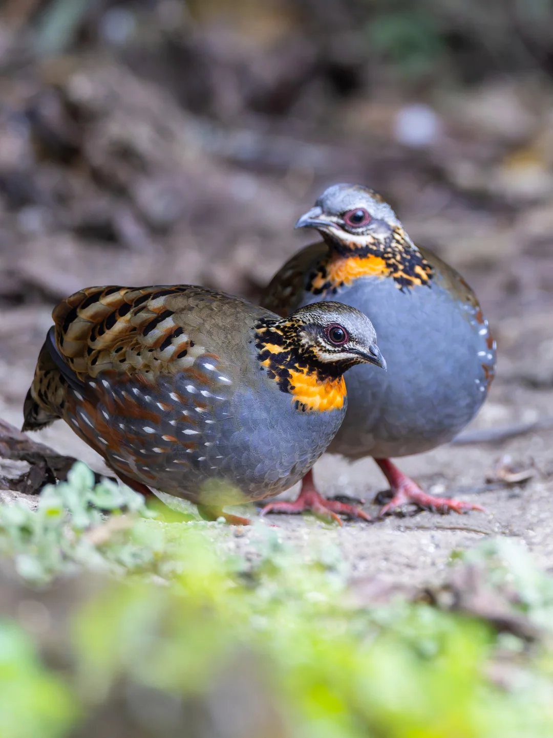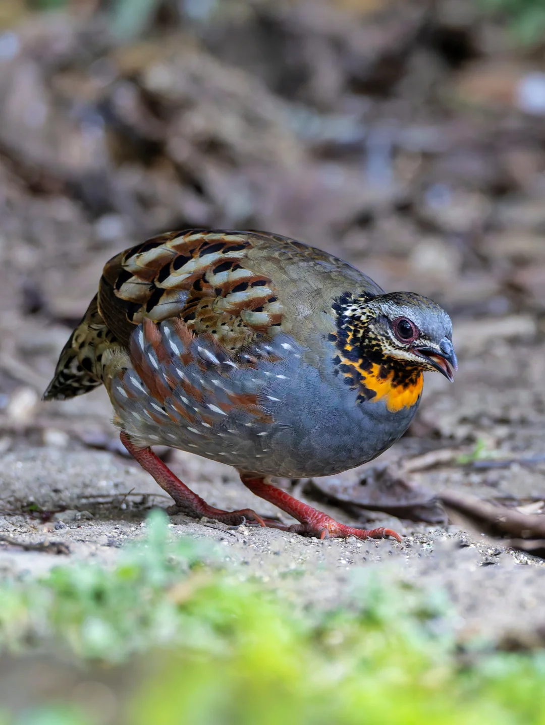 原创拍摄于2025.01 红喉山鹧鸪,Rufous-throated Partridge,鸡形目雉科山鹧鸪属。分布于印度北部到东南亚的森林里,在我国属于边缘分布,在滇西可以看到。国家二级保护动物。 红喉山鹧鸪有一个鲜艳的橙色喉咙,很显眼,蓝灰色胸部也是明显特征。和其他山鹧鸪一样圆滚滚的。可以说是高颜值小鸡。 这一群红喉山鹧鸪可能是一家子,最多的时候达到5只,在傍晚时分举家外出觅食。这是我在国内见过的第5种山鹧鸪,在我国9种山鹧鸪中才刚过一半。