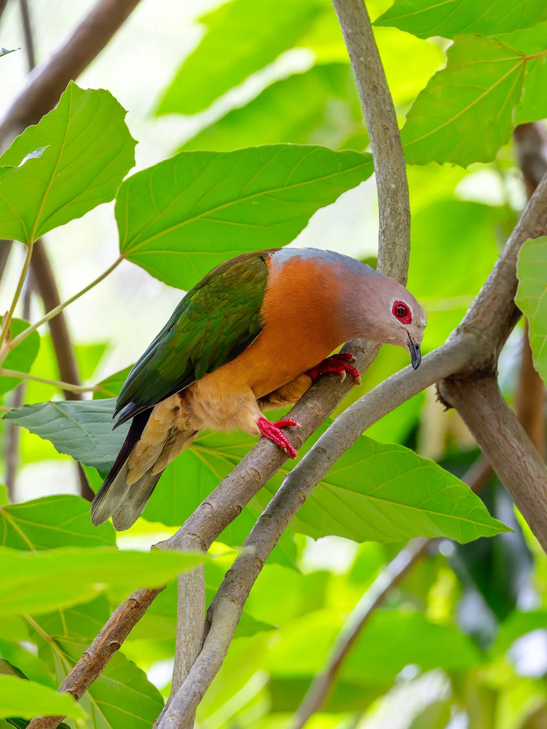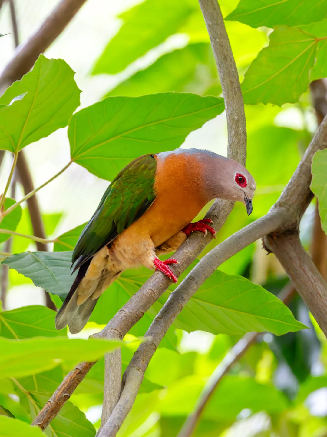 原创拍摄 紫尾皇鸠,Purple-tailed Imperial Pigeon,鸽形目鸠鸽科皇鸠属。是一种在新几内亚岛分布的漂亮大鸽子, 紫尾皇鸠得名于紫色的尾巴,虽然我拍的角度不明显,但是它们淡粉色的头部,橙色的胸腹,金属绿翡翠色的翅膀和背部,血红的眼睛和眼周裸皮,都非常的有特色,显得非常的高级。 紫尾皇鸠据说在新几内亚岛和周边岛屿行踪很诡秘,观察到的不多。