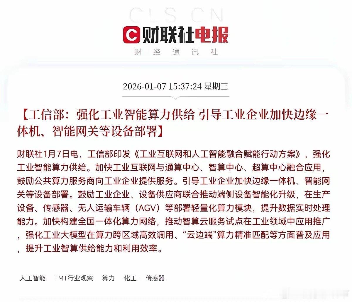 明天算力芯片又得涨,含AI量极高!工信部推动工业互联网改造升级 智能体、人形机器人获点名,这5万家企业进行升级改造,大幅推动我国企业智能化时代,AI人工智能快速的发展,这些企业设备都将升级为智能化,也在建设大规模的智能化网络,那未来的智算中心,超算中心都将融合这些应用场景,AI人工智能在快速与企业之间进行融合!未来将更加的高效发展,会带动更多的行业发展!在芯片行业的发展,还是传感器方面的发展,还是算力方面的发展,都会带动相关行业!