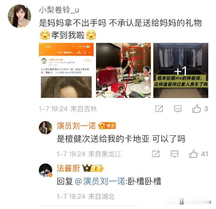 1月7日,刘一诺被质疑后带大名了! 提醒不理智粉丝别来沾边,直言本意没想公开,很多其他东西没发是不想给他造成困扰,如果还有人说她这那恋爱内容会全部公开 刘一诺回应完就删了,可惜速度没有网友快,网友现在很期待刘一诺把恋爱内容公开 还有人说刘一诺此番是为了宣传她的短剧 如果只是为了宣传短剧,那还好说,她心里有数,如果单纯是被司晓迪刺激,又被质疑,那这事大结束就是个未知数了! 檀健次