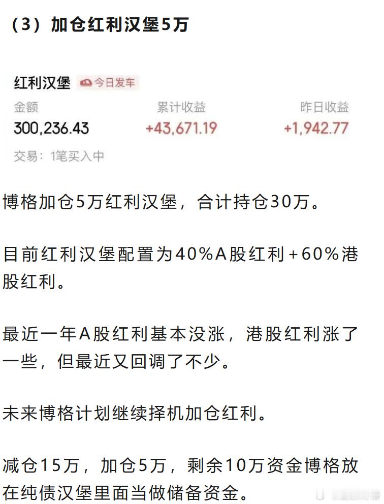 减仓了两个翻倍基今天减仓军工10万、减仓资源5万,加仓红利汉堡5万。具体操作如下(盘中已在私域发车):(1)减仓军工10万2025年12月30日,减仓10万军工基金,加仓1万医药汉堡包。今天继续减仓10万某(持仓收益118.42%的)军工基金,按单基金算减仓比例1/7,按军工大类计算减仓比例1/20。博格继续看好军工,减仓原因主要仓位太重了,目前军工占比超过15%了,短期目标是把军工仓位降低到15%以内。(2)减仓资源5万今天继续减仓5万某资源基金,按单个基金算减仓比例为1/12,按资源大类计算减仓比例1/15;博格目前资源类基金持仓还有80万左右,仓位占比不到10%,依旧看好资源基金在2026年的表现,但是为了降低组合波动,还是逢高减仓一点。(3)加仓红利汉堡5万博格加仓5万红利汉堡,合计持仓30万。目前红利汉堡配置为40%A股红利+60%港股红利。最近一年A股红利基本没涨,港股红利涨了一些,但最近又回调了不少。未来博格计划继续择机加仓红利。减仓15万,加仓5万,剩余10万资金博格放在纯债汉堡里面当做储备资金。基金港股a股