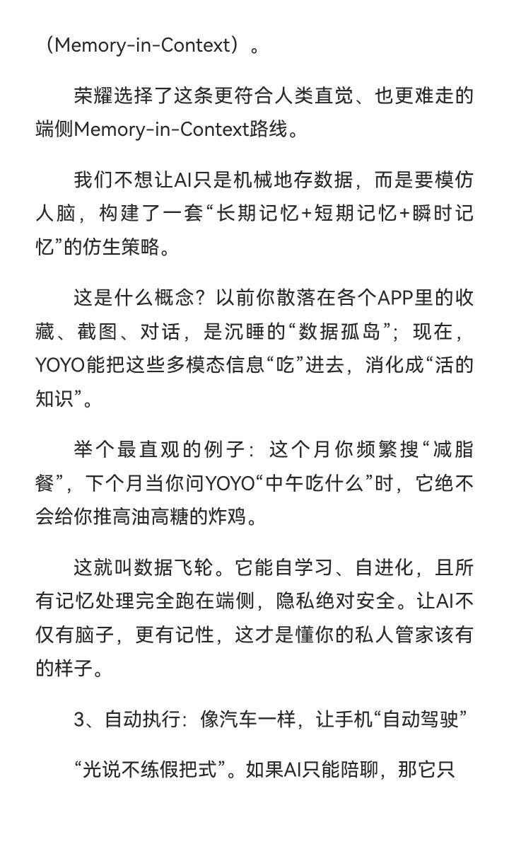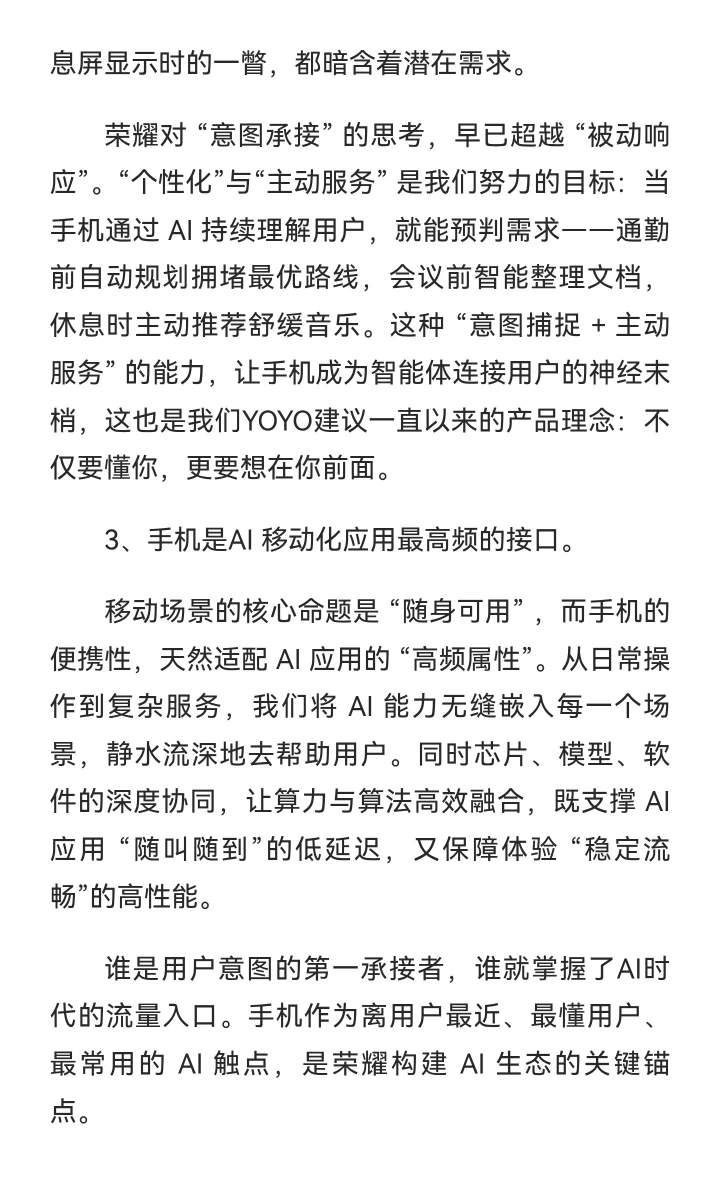 关于AI终端设备的未来,其实这个话题一直被探讨,也一直被讨论,甚至有人提到AI也会反感,但是究竟是什么Ai才能是为了需要的AI?看完荣耀关海涛发的一篇AI方面的内容,让我真的了解到,荣耀在AI方面的各个维度的探索,AI不仅仅有如YOYO建议一样的显性应用,也有很多很多隐藏在背后的算法和能力支撑,一台好的且大家都需要的Ai终端设备,一定是能够给用户带来改变的,我想荣耀一定会给出更多答案。科技数码数码资讯