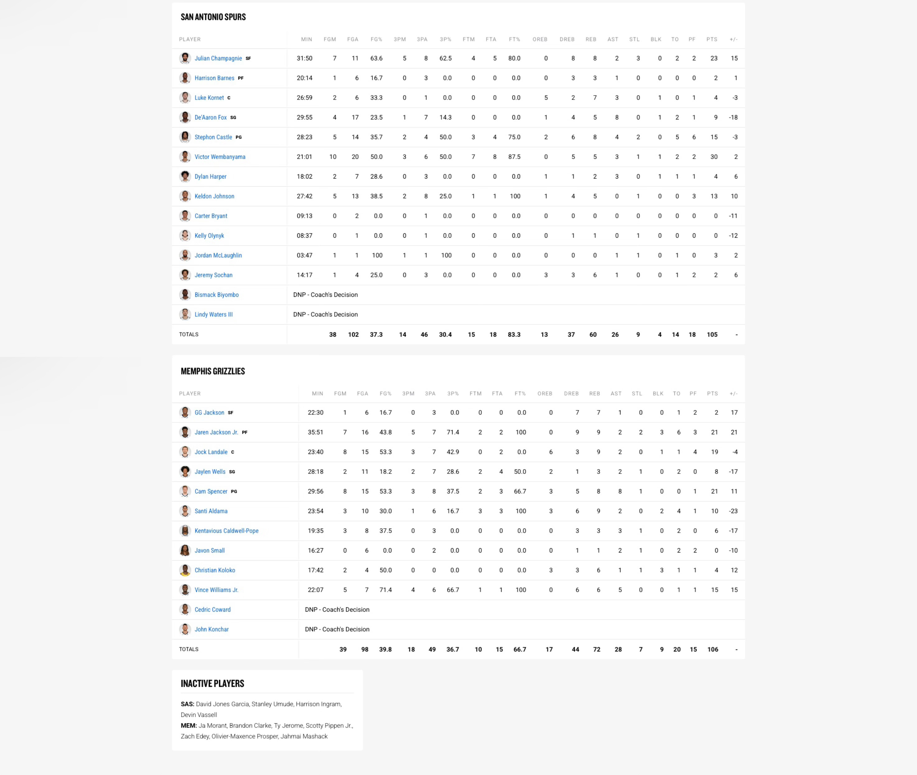 全场比赛结束!马刺客场105-106不敌灰熊,遭遇两连败马刺(25-11):文班亚马30分5板3助1帽、尚帕尼23分8板3助4断、卡斯尔15分8板4助2断、凯尔登13分5板、福克斯9分5板8助、科内特4分7板3助、哈珀4分2板3助、麦克劳林3分1助、索汉2分6板1助、巴恩斯2分3板1助、奥利尼克1板灰熊(16-20):杰克逊21分9板2助2断3帽、斯潘塞21分8板8助、兰代尔19分9板2助、威廉姆斯15分6板5助、阿尔达马10分9板2助2帽、韦尔斯8分3板2助、波普6分3板3助、科洛克4分6板1助3帽、GG·杰克逊2分7板1助、斯莫尔1板2助马刺下一场将在1月8日主场迎战湖人超话创作官 |篮球年末狂欢季 |马刺vs灰熊