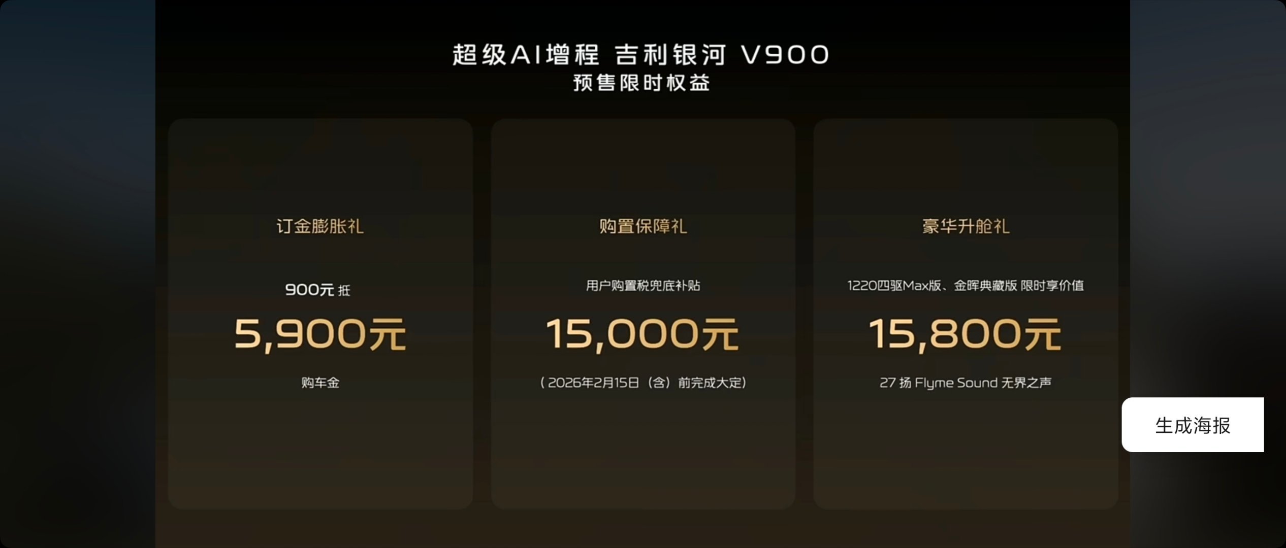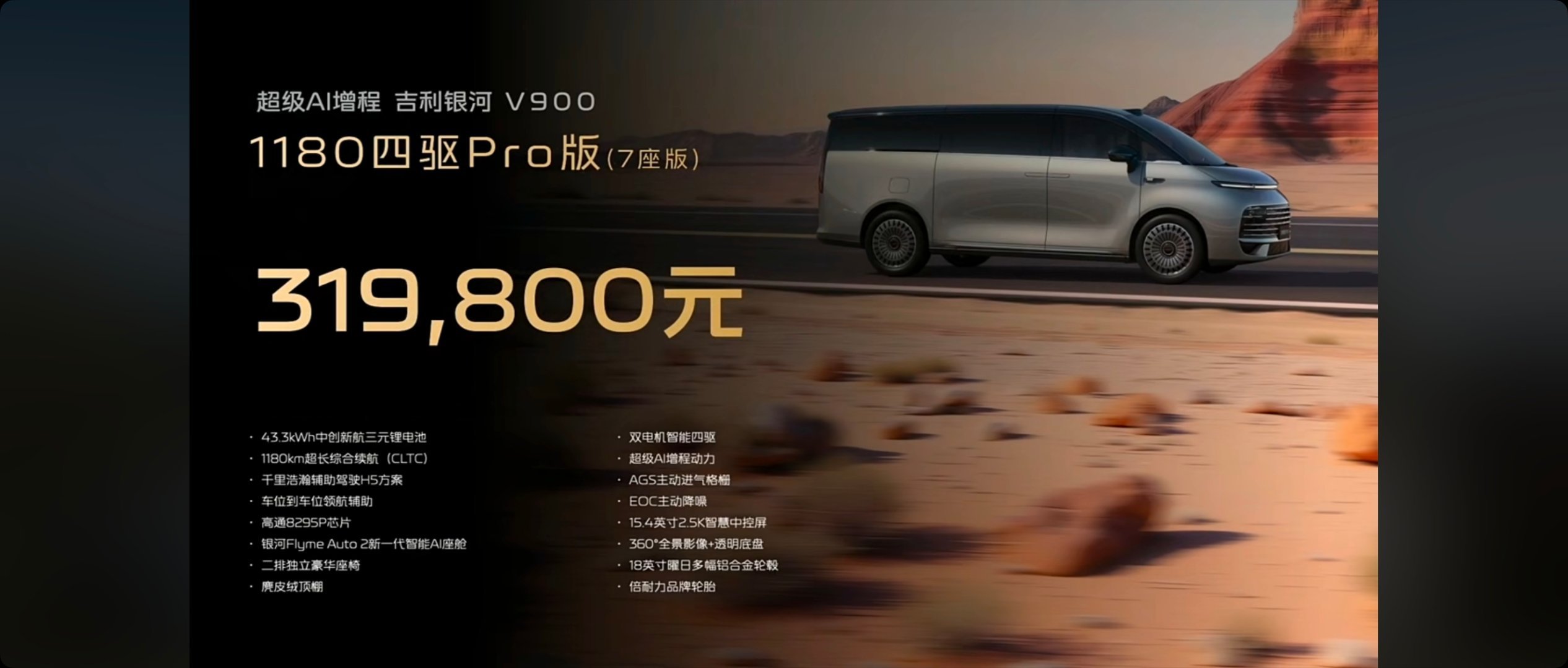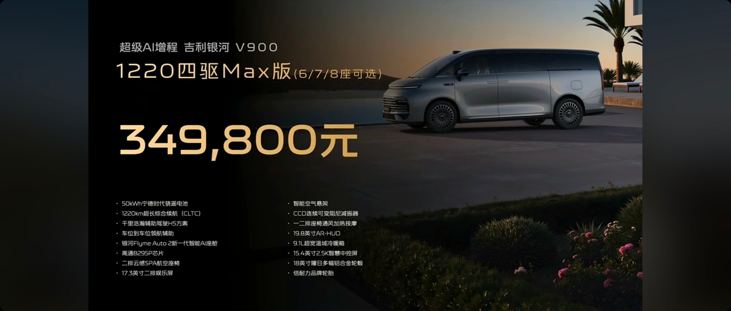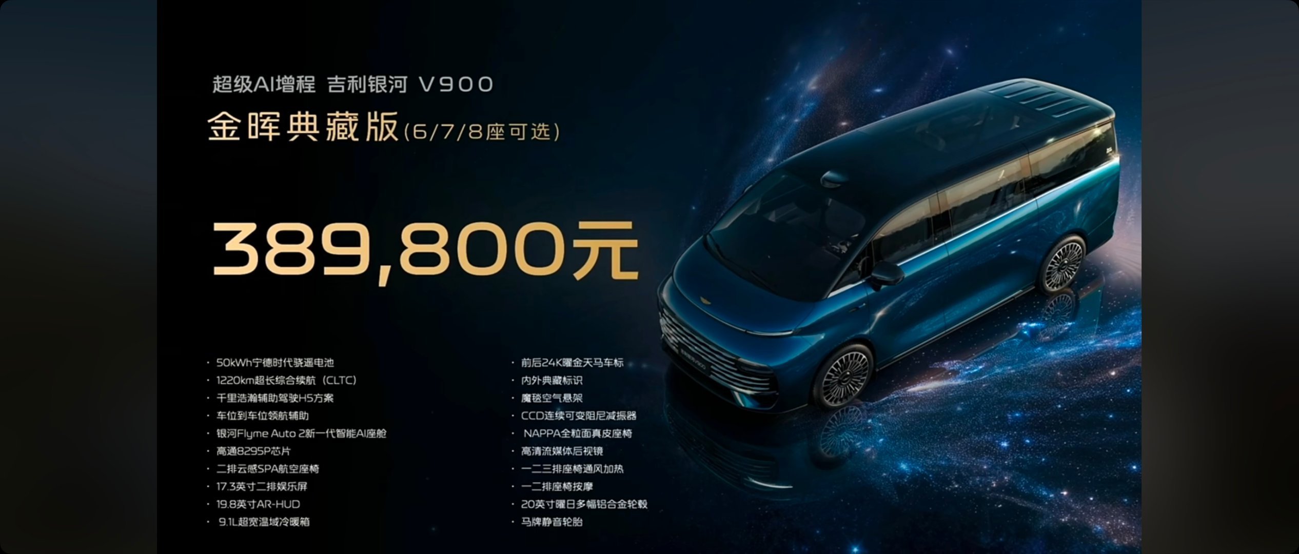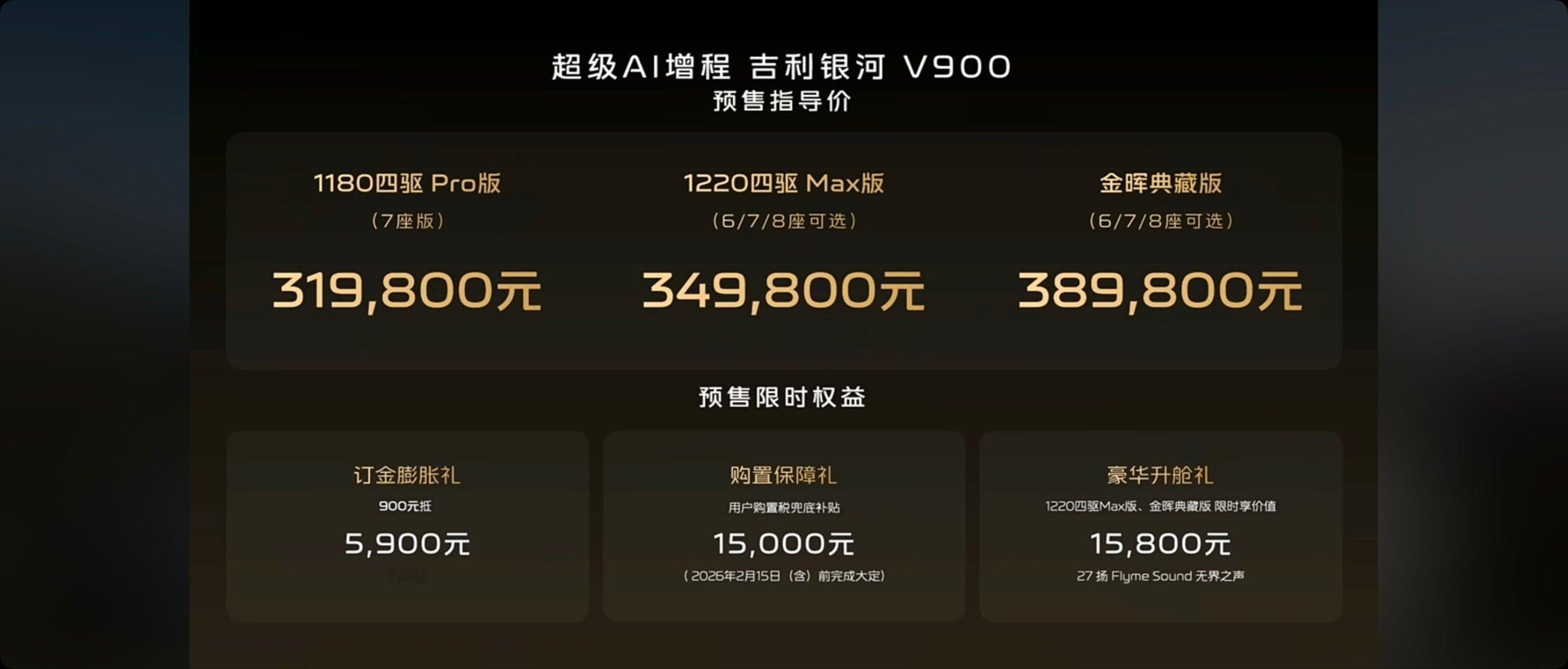31.98-38.98万的银河V900太香了吧银河V900基础参数:5360*1998*1920mm,轴距3200mm(中大型MPV)布局:六/七/八座(最大四排)驱动模式:增程/四驱前后电机发动机:1.5T发动机功率:120kW最大功率:340kW/523Nm电池续航:纯电220-260km/综合1200km电池容量:43.3-50kWh零百加速:6.5s悬架类型:前双球麦弗逊+后多连杆+CCD智驾硬件:激光雷达*1/12超声波/3毫米波辅助驾驶系统:千里浩瀚H5车机芯片:高通8295P车载系统:Flyme Auto 2.0后备厢:1100L/下沉空间:163L屏幕:液晶仪表+15.4中控屏+17.3后排娱乐屏+HUD颜色:外观蓝/黑/白/绿,内饰:米/橙轮毂尺寸:18/20英寸座椅配置:二排独立座椅/二排小桌板/二三排地台纯平/三排扶手其他配置:方向盘加热电调/电动踏板/后排全景天幕+遮阳帘/-6至50°冰箱/麂皮车顶包覆/副驾后220V电源/智驾小蓝灯/50w快充1180四驱Pro版(7座) 31.98万43.63kWh电池/EOC主动降噪/双电机四驱/360影像+透明底盘/二排独立豪华座椅/麂皮顶棚/18寸轮毂/14扬1220四驱Max版(678座) 34.98万50kWh宁德时代电池/二排spa航空座椅/二排娱乐屏/前排按摩/27扬声器空气悬挂/CCD可变阻尼/一二排通风加热按摩/19.8AR-HUD/二排全景天幕金晖典藏版(678座) 38.98万24k曜金标/MAPPA真皮座椅/一二排按摩/全车通风加热/20寸轮毂+静音胎/方向盘电调/魔毯预瞄预订政策:900抵5900购置税兜底15000中高配送15800的27扬这价格有5.3米的车长,3200的轴距,还给到了超大的空间,对比同级的例如高山8、小鹏x9也一点不虚,空间更大,简直了,又一个同级的标杆出现了,你们觉得三个配置,哪个最香呢?教授觉得中配就不错了。吉利银河V900预售价31.98万元起
