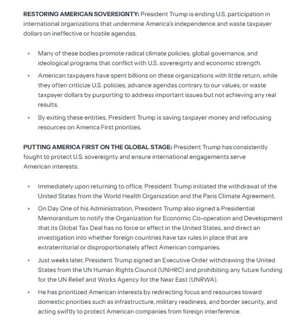 特朗普下令审查后退出66个国际组织 以“恢复美国主权”重塑国际参与格局 白宫消息,美国前总统特朗普已签署一份备忘录,指示政府在完成相关审查后,退出共计66个国际组织,并停止参与及资助35个非联合国组织与31个联合国下属实体。 特朗普在这份备忘录中明确表示,此举旨在“恢复美国主权”,重新审视美国在各类国际组织中的角色与投入,确保相关国际合作与美国的国家利益高度契合。 据悉,此次涉及的国际组织涵盖多个领域,既有聚焦全球治理、多边贸易的大型机构,也包含专注于特定领域事务的专业性组织。备忘录要求相关部门在规定时限内完成退出流程的规划与执行,同时妥善处理后续相关事务衔接。