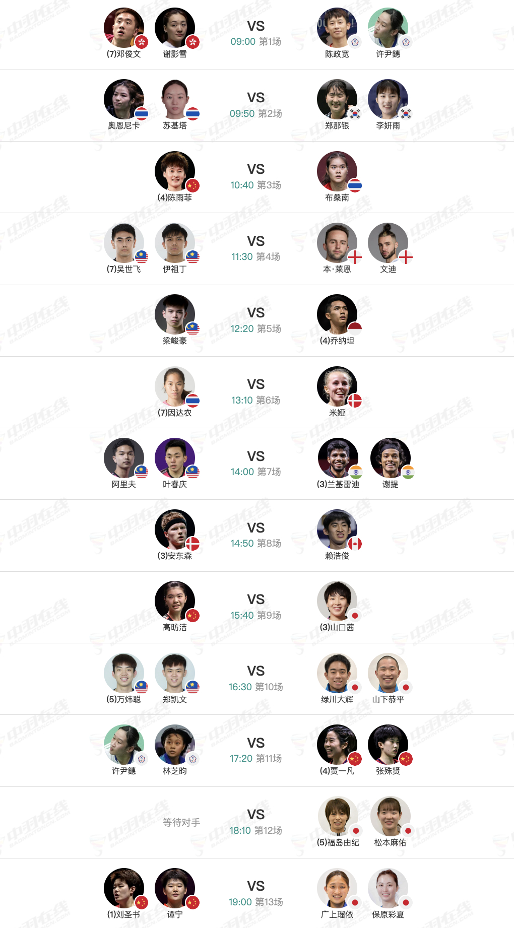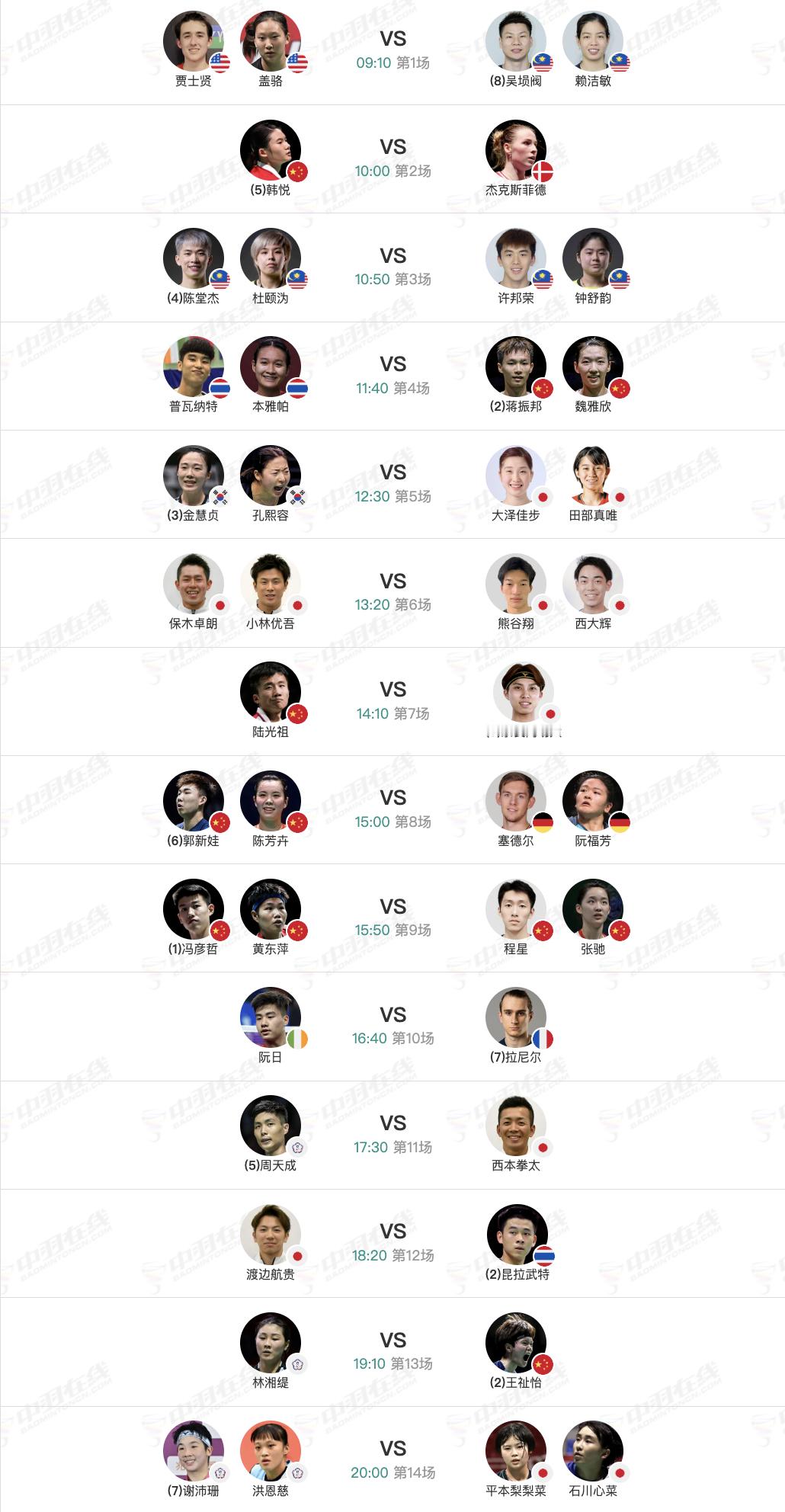 2026年马来西亚羽毛球公开赛 1月8日各单项16进8赛程,早上9点开赛:【1号场地】2、石宇奇🇨🇳 vs 🇮🇳阿尤什(1-0)9、陈旭君/刘阳🇨🇳 vs 🇲🇾谢定峰/苏伟译【2号场地】3、陈雨菲🇨🇳 vs 🇹🇭布桑兰(14-4)9、高昉洁🇨🇳 vs 🇯🇵山口茜(0-6)11、贾一凡/张殊贤🇨🇳 vs 许尹鏸/林芝昀(2-0)13、刘圣书/谭宁🇨🇳 vs 🇯🇵广上瑠依/保原彩夏(0-1)【3号场地】2、韩悦🇨🇳 vs 🇩🇰杰克斯菲德(3-1)4、蒋振邦/魏雅欣🇨🇳 vs 🇹🇭普瓦纳特/本雅帕7、陆光祖🇨🇳 vs 🇯🇵奈良冈功大(4-3)8、郭新娃/陈芳卉🇨🇳 vs 🇩🇪塞德尔/阮福芳9、冯彦哲/黄东萍🇨🇳 vs 🇨🇳程星/张驰(1-0)13、王祉怡🇨🇳 vs 林湘缇(3-0)