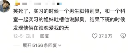 笑死了,实习的时候一个男生脚特别臭,和一个科室一起实习的姐妹吐槽他说脚臭,结果下班的时候发现他俩在谈恋爱