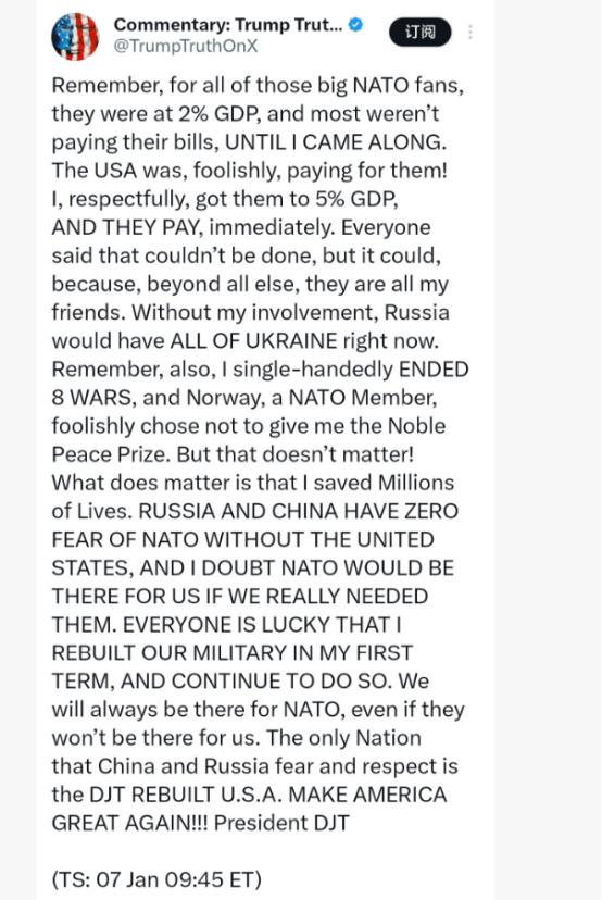 特朗普1月7日发文说:听着,那些北约的铁杆拥趸们,听好了——在我横空出世之前,他