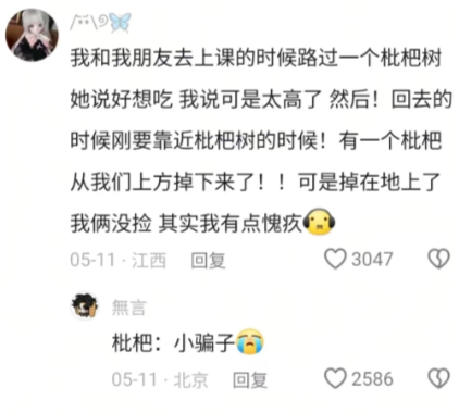 我和我朋友去上课的时候路过一个枇杷树她说好想吃 我说可是太高了 然后!回去的时候刚要靠近枇杷树的时候!有一个枇杷从我们上方掉下来了!!可是掉在地上了我俩没捡 其实我有点愧疚