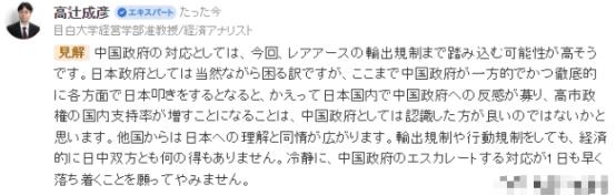 日本见抗议无效,现在开始换套路了。针对中国对出口日本军民两用物项的限制禁令,日本经济专家高辻成彦今天开始“警告”中国了。他说:中国对日本进行限制,当然会造成日本的困扰,但中方如此单方面的打压日本,势必会加剧日本国内对中国的“反感”,进而推高高市早苗的国内支持率。他还强调“中国最好认清这一点”。 这位高辻成彦可不是普通的经济评论员。他早年在日本经济产业省待过,还做过企业IR和经济分析师,常年混在日本经济和政策圈里。他说的这话,与其说是个人观点,不如说是日本官方找不到反驳理由,借专家之口放出来的舆论试探。 毕竟直接抗议会被中方按在道理上驳斥,根本说不过去,他们就想换个角度施压,拿所谓的“国内反感”和“政治支持率”做文章。他们以为这样就能让中国投鼠忌器,想着是不是该松松手,免得把日本国内对华情绪推到对立面。 可日本显然打错了算盘,他们压根没搞明白,中国这禁令从来不是单方面“打压”,而是维护自身国家安全的必要手段。是日本先突破底线在前,中方反制在后,因果关系说得明明白白。 高辻成彦说限制会给日本造成困扰,这话倒没说错,但他故意避重就轻,不提这困扰是谁造成的,也不提这困扰有多致命。 中国这次限制的不是普通商品,而是上千项军民两用物项,里面包括镓、锗、中重稀土这些关键战略资源,还有无人机、传感器、耐高温材料等设备技术。 日本在这些资源上对中国的依赖度特别高,就说镓,日本是全球最大的消费国,40%的供应都靠中国,而镓正是宙斯盾雷达、战机雷达的核心材料。 中重稀土就更不用说了,日本71.9%的进口都来自中国,钕、镝这些元素是导弹转向部件、潜艇电机的关键。没有这些东西,日本正在推进的高超音速导弹、“大鲸”级潜艇,还有从美国买的F-35隐形战机,全都得卡壳。 每架F-35要消耗四百多公斤稀土,雷达用的钕铁硼永磁材料也离不开中国供应。就算美国想帮衬日本,也绕不开中国的供应链,毕竟美国制造武器需要的钐元素,完全得靠从中国进口。 至于说限制会加剧日本国内反感、推高高市早苗的支持率,这纯粹是日本的自我安慰,也是在搞舆论绑架。高市早苗本身就是右翼保守派,靠对华强硬、炒作“台湾有事就是日本有事”拉拢保守派选票,她的支持率本来就建立在对抗性言论上。 可日本国内也不是铁板一块,经济界早就急得火烧眉毛了。日中经济协会、经团联这些大团体,原本计划组织两百人的代表团访华,结果因为中日关系紧张,只能无限期推迟。 中国市场对日本企业太重要了,不光是资源上依赖,之前旅游业、水产业就因为高市早苗的涉台言论受了重创。现在军民两用物项被限制,军工产业链受影响,连带相关制造业也会跟着承压。 普通民众感受到经济压力后,到底反感的是中国,还是把国家带向对抗的高市早苗政府,还真不好说。高辻成彦刻意放大“反感”这个点,无非是想营造一种“中国反制会适得其反”的假象,掩盖日本内部经济和政治的矛盾。 日本心里清楚,硬抗议没用,就想靠这种话术给中国施压,本质上还是没认清现实。他们觉得拿国内政治格局当筹码,就能让中国妥协,却忘了中国在核心利益问题上从来不会退让。 这次的禁令不是一时兴起,有明确的法律依据,符合《中华人民共和国出口管制法》,也是在履行防扩散的国际义务,完全站得住脚。 日本之前一边跟着美国搞军事扩张,买“战斧”导弹、建宙斯盾舰,一边在台海问题上指手画脚,总想干涉中国内政。现在尝到反制的滋味了,不反思自己的错误,反而换套路玩舆论战,这种做法实在不明智。 高辻成彦让中国认清所谓的“后果”,倒不如让日本自己先认清现实。中国早就不是以前那个能被几句警告拿捏的国家了,既然敢出台这项禁令,就不怕日本的舆论施压,更不会被所谓的“支持率”绑架。 日本真正该做的,是纠正涉台错误言论,停止推动军事扩张,而不是靠耍小聪明换套路。要是继续抱着对抗心态,不拿出诚意改善关系,后续受到的影响只会更大。 到时候不光是军工产业链,整个日本经济都会跟着遭殃,高市早苗的支持率就算短期被推高,迟早也会因为民众的不满而下滑。毕竟民众要的是安稳日子和向好的经济,不是靠炒作对立换来的虚假支持,日本这套新套路,最后终究是搬起石头砸自己的脚。