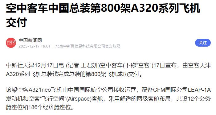 聪明反被聪明误,美国想要封锁中国航空,没想到中国转头换东家,美国这波操作直接帮了空客大忙,特朗普估计都要气炸了! 2025年的中美在民用航空领域的交锋可谓激烈至极,眼看着中国商飞的C919客机逐步崛起,开始在全球民用航空市场分一杯羹,美国坐不住了,年初就打响了封锁第一枪。 先是宣布暂停向中国商飞出售关键的喷气发动机技术,直接卡住了C919部分零部件的供应渠道,试图让中国大飞机项目陷入停滞。紧接着,美国又加码关税战,对出口中国的波音飞机相关产品加征高额关税,倒逼中国航司放弃采购波音客机。 到了下半年,更是想出了禁止中国航司往返美国航班飞越俄罗斯领空的损招,企图通过增加中国航司的运营成本来削弱竞争力。 美国的算盘打得噼啪响,以为这套组合拳能让中国航空业束手就擒,乖乖向其妥协。可他们万万没料到,中国早就做好了应对准备,既然你不仁,那我便另寻出路。 面对美国的全面封锁,中国航司果断暂停接收波音新飞机,原本计划交付的几十架波音客机要么退回美国,要么直接取消订单。 与此同时,中国转头深化与欧洲空客的合作,把原本可能交给波音的订单稳稳送到了空客手中,这波转向直接让空客迎来了发展良机。 2025年10月,空客在天津的第二条A320系列飞机总装线正式投产,预计2026年初就能全面运营,产能直接翻倍。 到了12月,天津总装线交付的空客飞机总量已经突破800架,中国市场已然成为空客最大的单一国别市场,空客在中国民航机队中的占比也飙升至50%以上。 空客CEO傅里直言,即便面临地缘政治挑战,也会持续在中国投资,拓展本地供应链。 更关键的是,中国不仅自己采购空客飞机,天津总装线生产的飞机还有25%交付给了欧洲、亚洲、中东等地区的海外客户,帮空客进一步扩大了全球市场份额。 反观美国这边,可真是赔了夫人又折兵。波音公司原本计划2025年向中国交付近50架飞机,结果因为中国航司暂停接收,大量订单被搁置,甚至不得不把已经运到中国的飞机退回美国,转而寻找其他买家。 中国曾是波音最重要的海外市场,巅峰时期每年交付给中国的飞机占其全球总量的25%,如今却彻底失去了这片沃土。 美国政府的封锁措施,不仅没打垮中国航空业,反而倒逼中国加快国产商用飞机动力的研发,同时还撕裂了波音经营数十年的中美航空产业纽带。 对于美国的封锁,中方始终保持坚定立场,中国驻美使馆和外交部多次明确表态,坚决反对美方滥用国家安全概念、恶意封锁打压中国企业,强调中方会坚决维护自身正当权益。 事实也证明,在全球产业链深度融合的今天,任何试图人为割裂市场的行为都是徒劳的。美国本想靠封锁遏制中国,结果却帮了竞争对手空客的大忙,让自己的航空企业蒙受巨大损失,这样的结局着实令人唏嘘。 这一年的中美航空领域对抗,彻底戳破了美国霸权逻辑的荒谬。所谓的“封锁打压”,最终只会让自己陷入孤立。 中国始终坚持开放合作的态度,在困境中寻找新机遇,既保障了自身航空业的稳定发展,也深化了与其他国家的互利共赢。