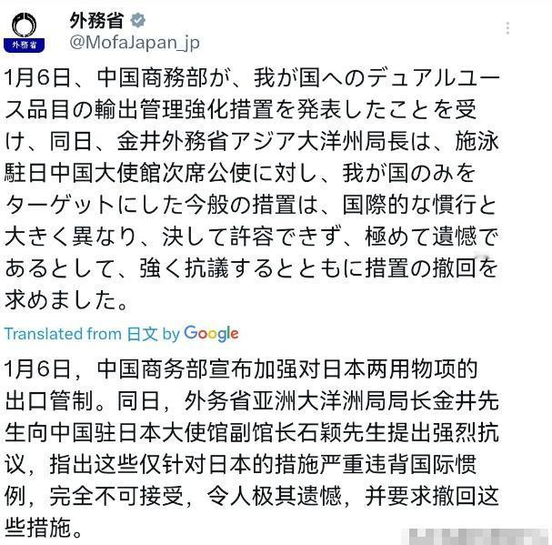 日本出来回应了,态度非常气愤! 1月6日,我国商务部依法宣布强化对日本两用物品的出口管制措施。仅仅一天后,日本外务省就迫不及待跳出来发难,声称中方这一措施专门针对日本,与国际通行惯例严重不符,完全不可接受。 不仅如此,其亚洲大洋洲局局长金井还专门找到中国驻日大使馆的公使衔参赞,提出所谓的“强烈抗议”,一边故作姿态地表示“深表遗憾”,一边蛮横要求中方撤回该措施,这番颠倒黑白的操作,着实让人火冒三丈。 日本现在摆出这副咄咄逼人的架势,全然忘了之前自己是如何无视中方立场、肆意挑衅的。 大家应该还记得,此前日本首相高市早苗曾发表极其恶劣的涉台错误言论,公然称“台湾有事”可能构成日本的“存亡危机事态”,暗示要武力介入台海问题,这无疑是对我国内政的粗暴干涉,严重伤害了中国人民的感情。 当时我国多个部门先后向日本提出严正交涉,强烈要求高市早苗撤回这番错误言论,消除恶劣影响。 可结果呢?高市早苗对此置若罔闻,执意不撤回言论,日本方面也丝毫没有悔改之意。有因必有果,事到如今,日本又有什么资格来要求中方撤回措施? 当初我国的合理诉求,他们当耳旁风,现在轮到自己利益受损了,就急不可耐地跳出来抗议,这双重标准玩得实在太过明显。 国家之间的交往,最基本的就是相互尊重、平等相待。日本既然之前选择了无视中方的核心利益,做出不友好的举动,就应该想到会有相应的后果,现在又何必惺惺作态地喊冤叫屈? 面对这样一个屡次挑衅、拒不悔改的国家,过度的宽容只会被当成软弱可欺。 台湾问题是我国的核心利益,任何国家都无权干涉,这是底线中的底线。高市早苗的言论已经触碰了这条红线,我国采取必要的反制措施,既是维护自身权益的正当之举,也是对日本不当行为的有力警示。 再说,我国的出口管制措施,本质上是为了维护国际防扩散体系,维护地区和世界的和平稳定。日本口口声声说“不符国际惯例”,其实是在混淆视听。 全球大多数国家都有类似的出口管控制度,目的就是防止敏感物品和技术被用于军事领域,这是国际社会的普遍共识。 日本之所以反应这么激烈,无非是担心自身的军事扩张计划受到影响,这种野心昭然若揭。 希望日本能早日认清现实,深刻反省自己的错误言行,不要再在错误的道路上越走越远,否则只会给自己带来更多不利后果。北约能制裁俄罗斯三万项,作为全世界唯一的全产业链国家,这1000项管制显然只是个开始。