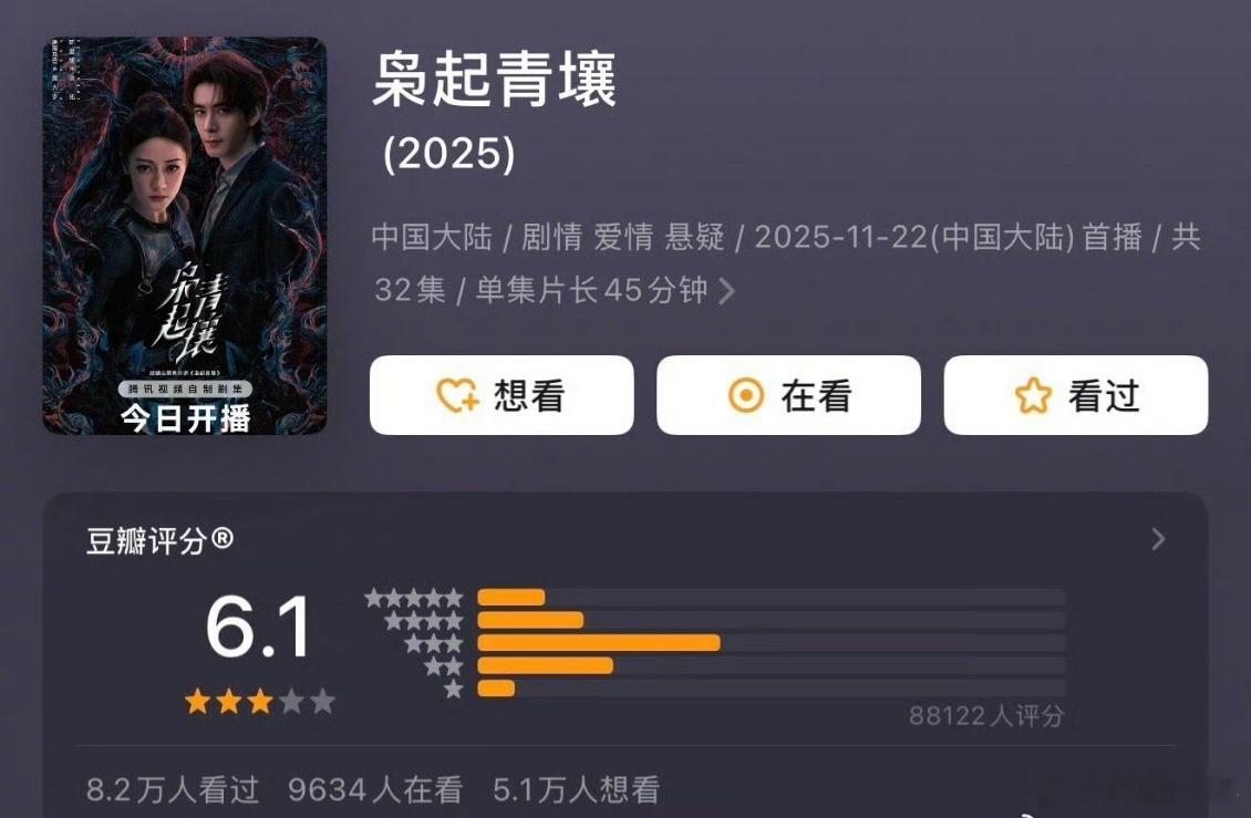 迪丽热巴陈星旭枭起青壤成绩迪丽热巴枭起青壤热播期完结 剧集热播期集均1634万的成绩,在影视行业调整期属于合格的市场表现,而豆瓣6.1分则折射出奇幻题材的评价两极分化现象——喜欢的观众认可其制作与演员适配度,不接受该设定的观众则给出较低评价。