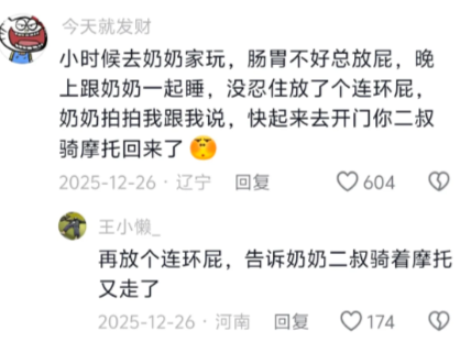 小时候去奶奶家玩,肠胃不好总放屁,晚上跟奶奶一起睡,没忍住放了个连环屁,奶奶拍拍我跟我说,快起来去开门你二叔骑摩托回来了