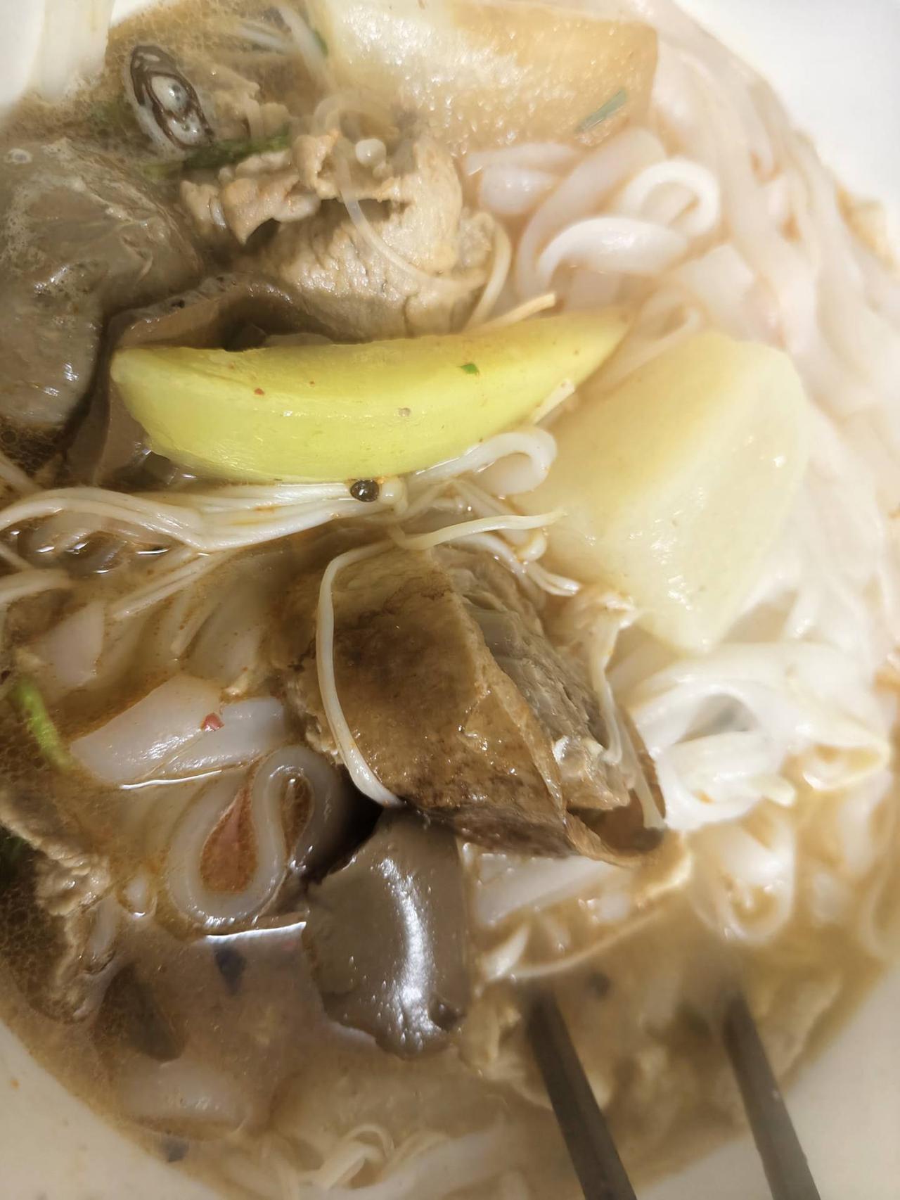翻了翻冰箱全是剩菜剩饭,懒得做饭又不想点外卖,直接煮了碗广东河粉搞个大杂烩~ 把剩的土豆、排骨还有点菌菇全丢进汤里,河粉烫软捞出来一拌,一碗热乎乎的河粉就搞定了! 河粉吸满了汤汁,滑溜溜的超入味,剩菜也一点没浪费,广东人对河粉的执念大概就是,不管啥配菜都能搭一起,简简单单一碗就把午饭安排得明明白白