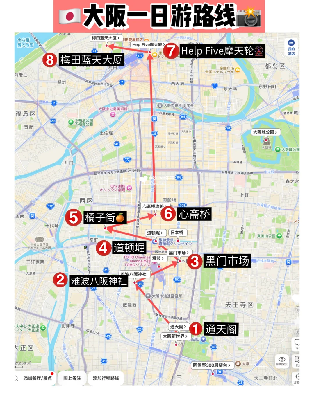 👉通天阁➡难波八阪神社️➡黑门市场➡道顿堀➡橘子街➡心斋桥➡hepfive摩天轮➡梅田蓝天大厦