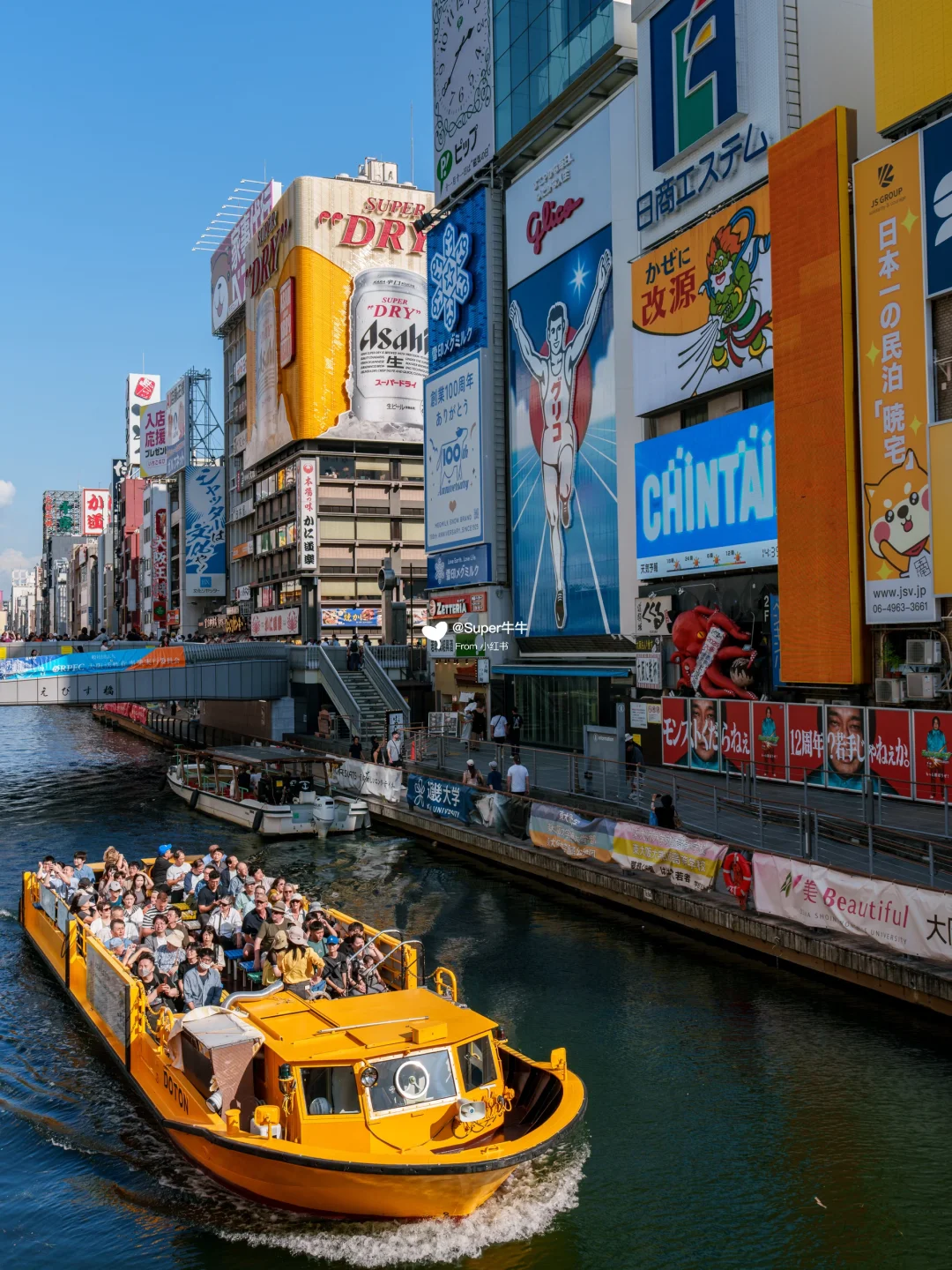 3️⃣运河上的黄色观光游船与两岸的巨型招牌
