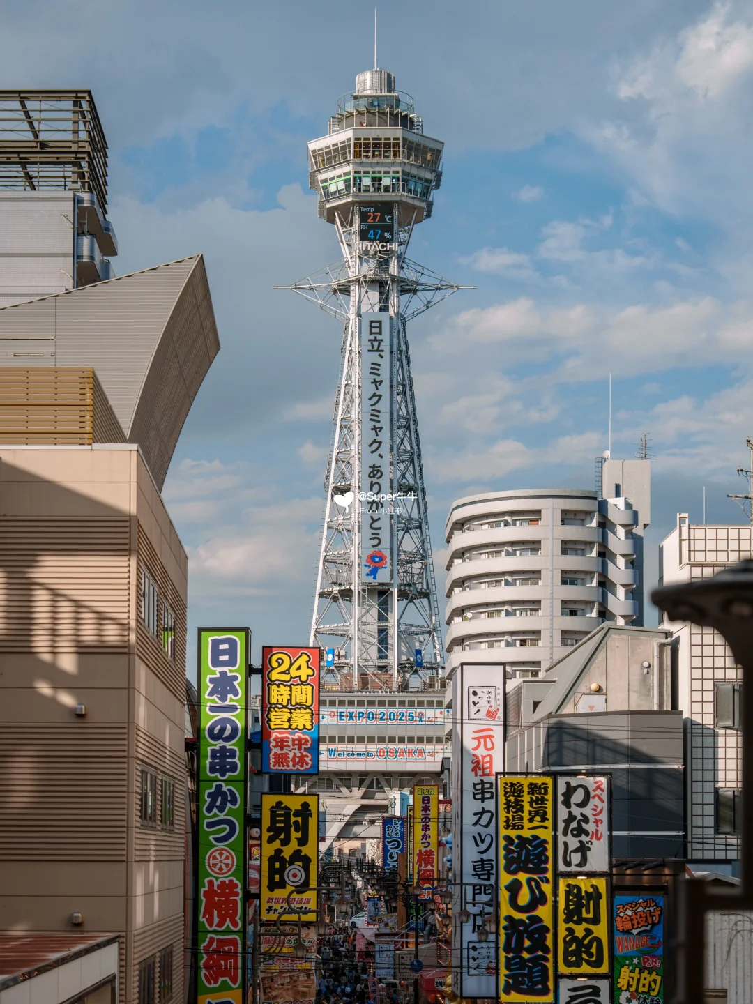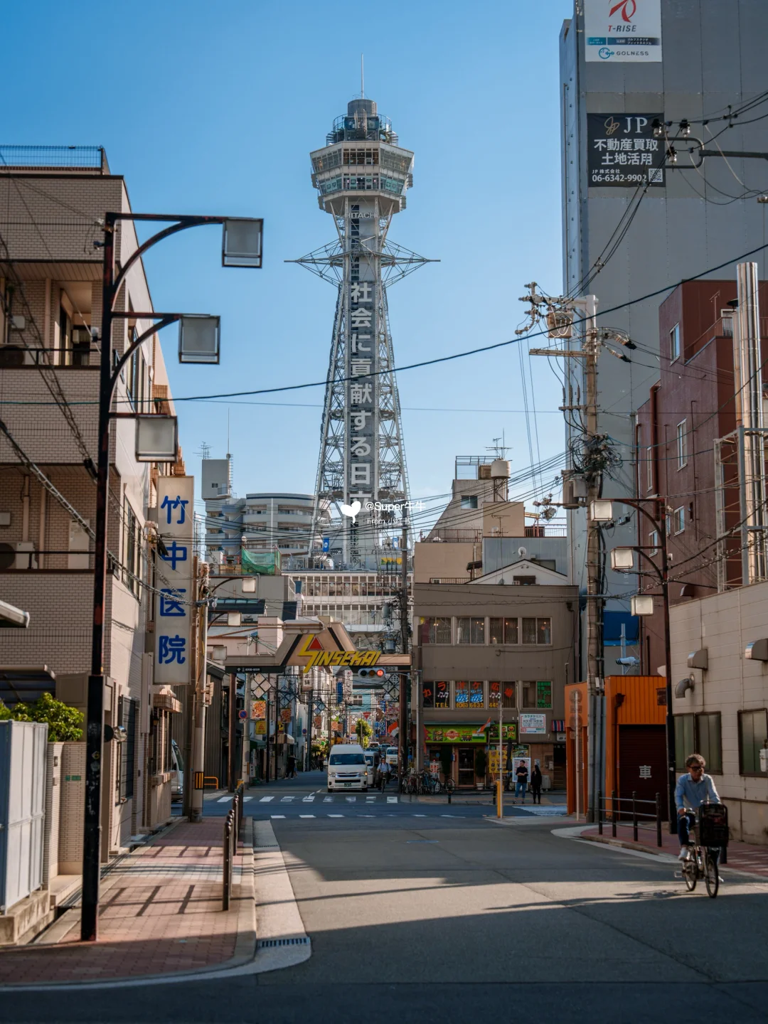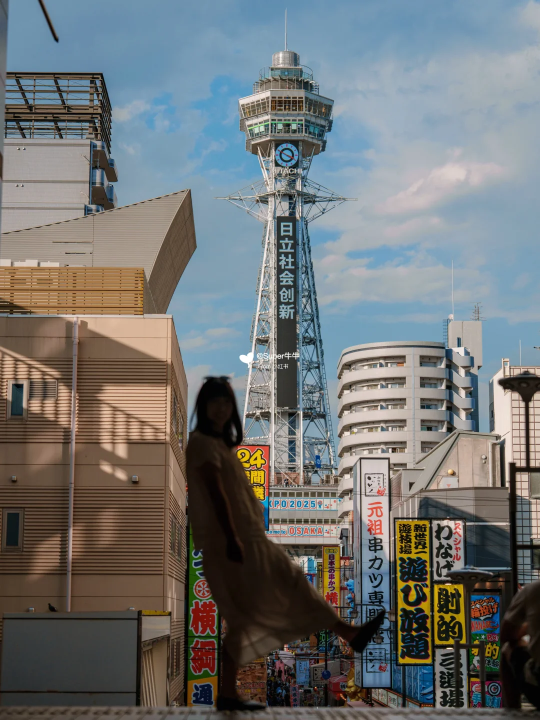 2️⃣下楼梯在路的中间与通天阁、热闹街区合影