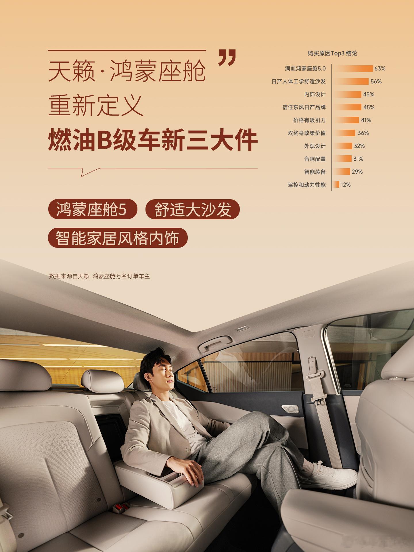 天籁鸿蒙座舱首批万台订单的车主画像一出来,显示49%都是年轻人,其实一点都不意外。属于是刚站稳脚跟的社会新力量,买车可太懂自己要啥了!既要2.0T VC-Turbo发动机的猛劲儿和推背感,又要鸿蒙座舱5的丝滑智能,免唤醒语音控制、手机车机无缝流转……该有的科技便利一点都不能少。以前总有人说,燃油车和智能化只能二选一,想省油智能就选电车,想动力靠谱就得忍油车的老派内饰和拉胯车机。但天籁鸿蒙座舱直接把这道选择题变成送分题,加“智”不加价,15万级预算就能拿下。万台订单直接证明,现在的燃油B级车车主,早就不是刻板印象里的样子了!是时候重新认识燃油B级车车主了天籁鸿蒙座舱