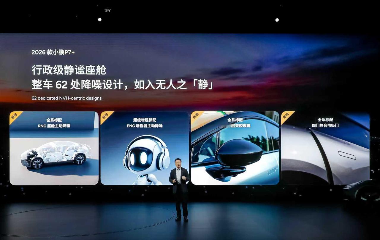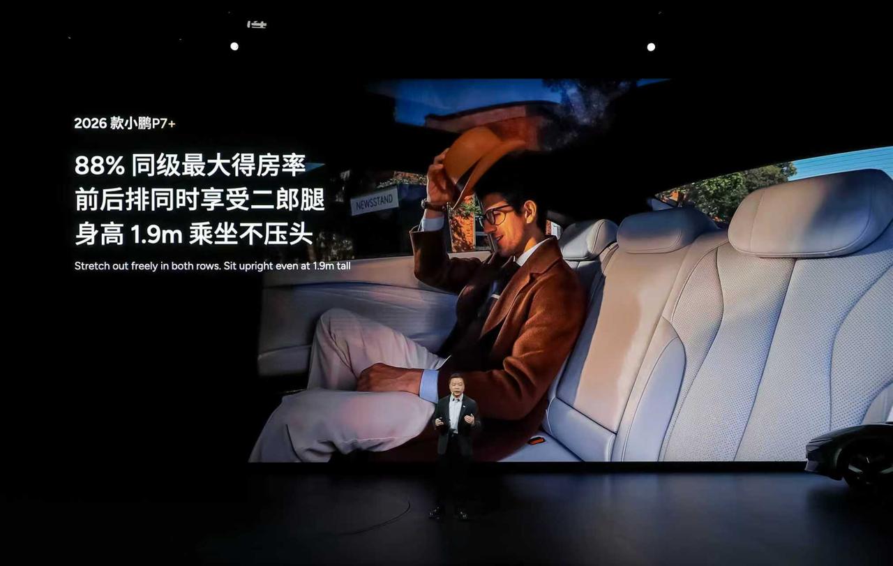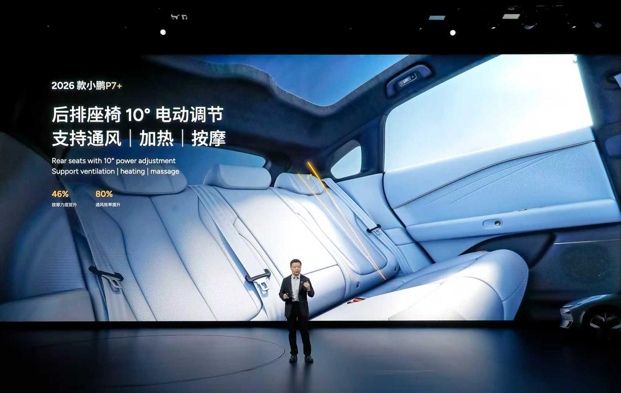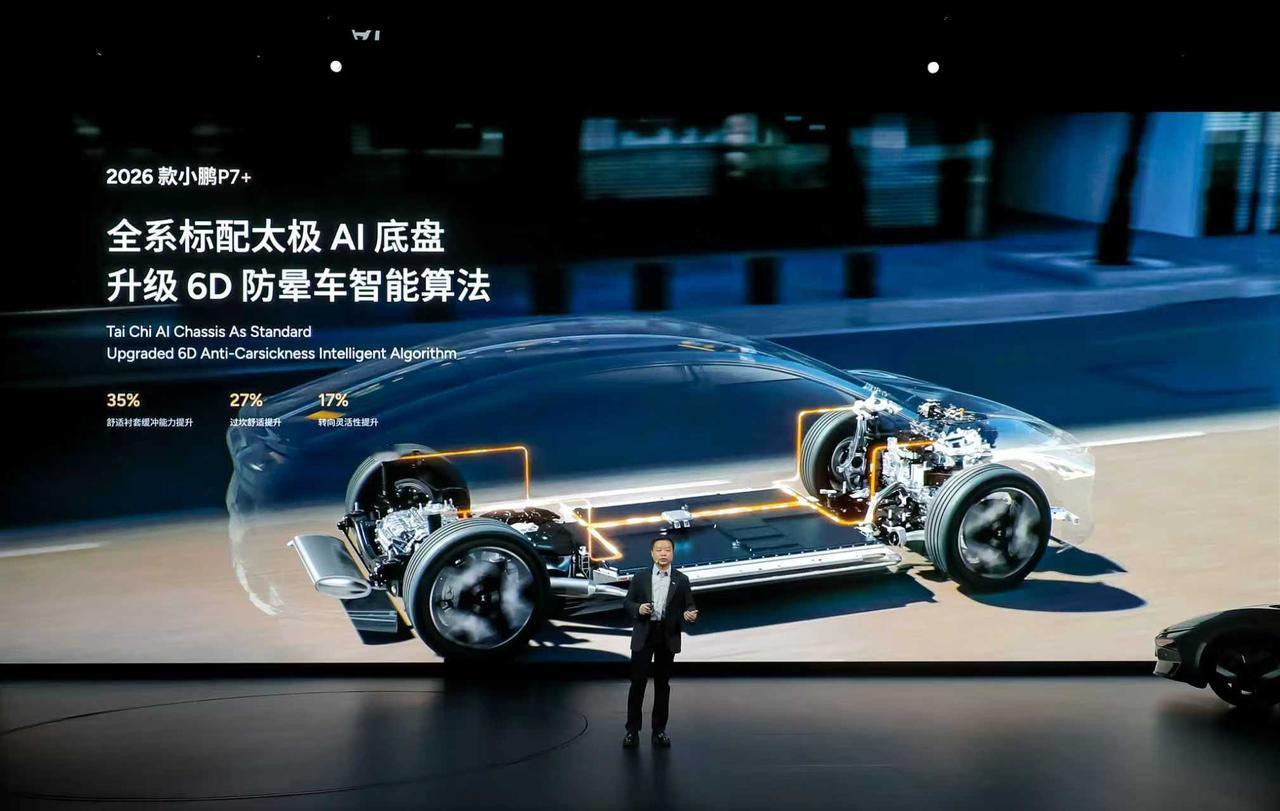 静音拉满、能装到爽、舒适在线,2026款小鹏P7+就是出行理想型! 360°柔性包裹云感座舱,拥有「零压」座椅、座椅通风、按摩力度升级、Micro Fiber超纤绒顶棚等舒适享受,副驾还可选装零重力座椅把舒适拉满;后排座椅10°电动调节,支持通风/加热/按摩; 20扬声器聆境AI音响,整车的音响功率提升了 10%,放入电影院里的音响质感; 整车62处降噪设计,配置5.36mm 双层夹胶玻璃,加上RNC +ENC座舱主动降噪技术,仿佛拥有行政级静谧座舱; 88%同级最大得房率,前后排人均1m乘坐空间,身高1.9m乘坐不压头; 725升后备箱,最大可扩展空间为2221升,塞得下33个20寸行李箱,简直是空间王者,装载力无对手; 全系标配智能可变阻尼减振器,颠簸道路时明显提升舒适性;高速过弯时也可通过调节阻尼,让车辆更具支撑性。 全系标配太极AI底盘,升级6D防晕车智能算法,舒适衬套缓冲能力提升35%,过坎舒适提升27%,转向灵活性提升17%。 小鹏新年四车齐发 新款小鹏P7+自带空间魔法