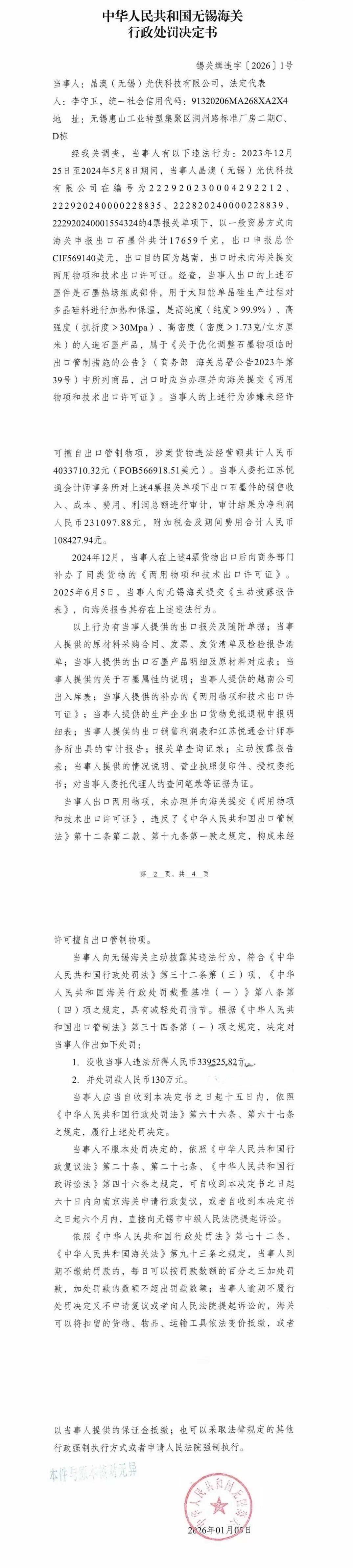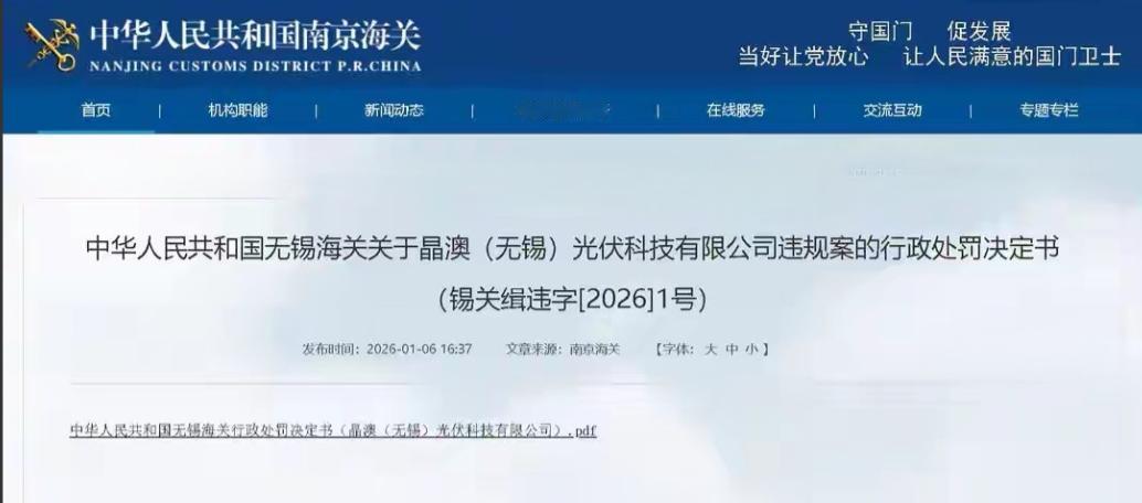 开年第一罚单砸向晶澳! 无锡海关发布的锡关缉字[2026]1号行政处罚决定书显示:这家光伏巨头因未经许可擅自出口管制物项,被没收违法所得33.95万元,再加130万元罚款,合计超163万的罚没款! 130万是鼓励奖吧!吃国家饭,还要砸国家的锅,这种资敌行为应该从严从重处理!严重的直接拉去打靶! 对这些顶风违纪,不顾国家利益,只考虑自己的企业,实际上是一种扩大了的个人主义,也是自私自利的具体表现,不仅要罚款,要重罚,而且要让决策者坐牢。 罚款太少,完全没有威慑性,让很多人为了个人利益铤而走险,应该直接罚到破产,并且相关高管人员和报关人员全部按走私罪判刑。