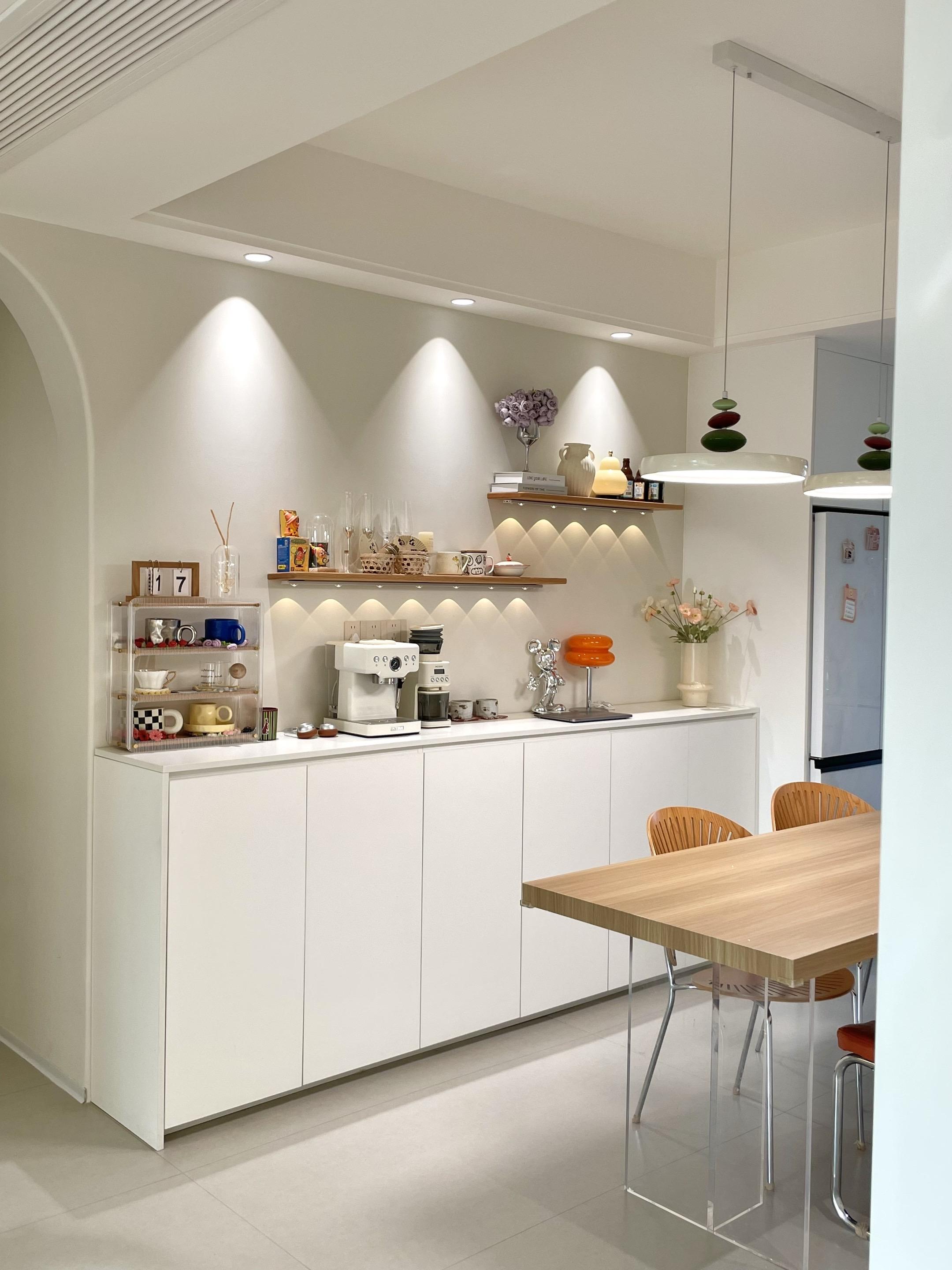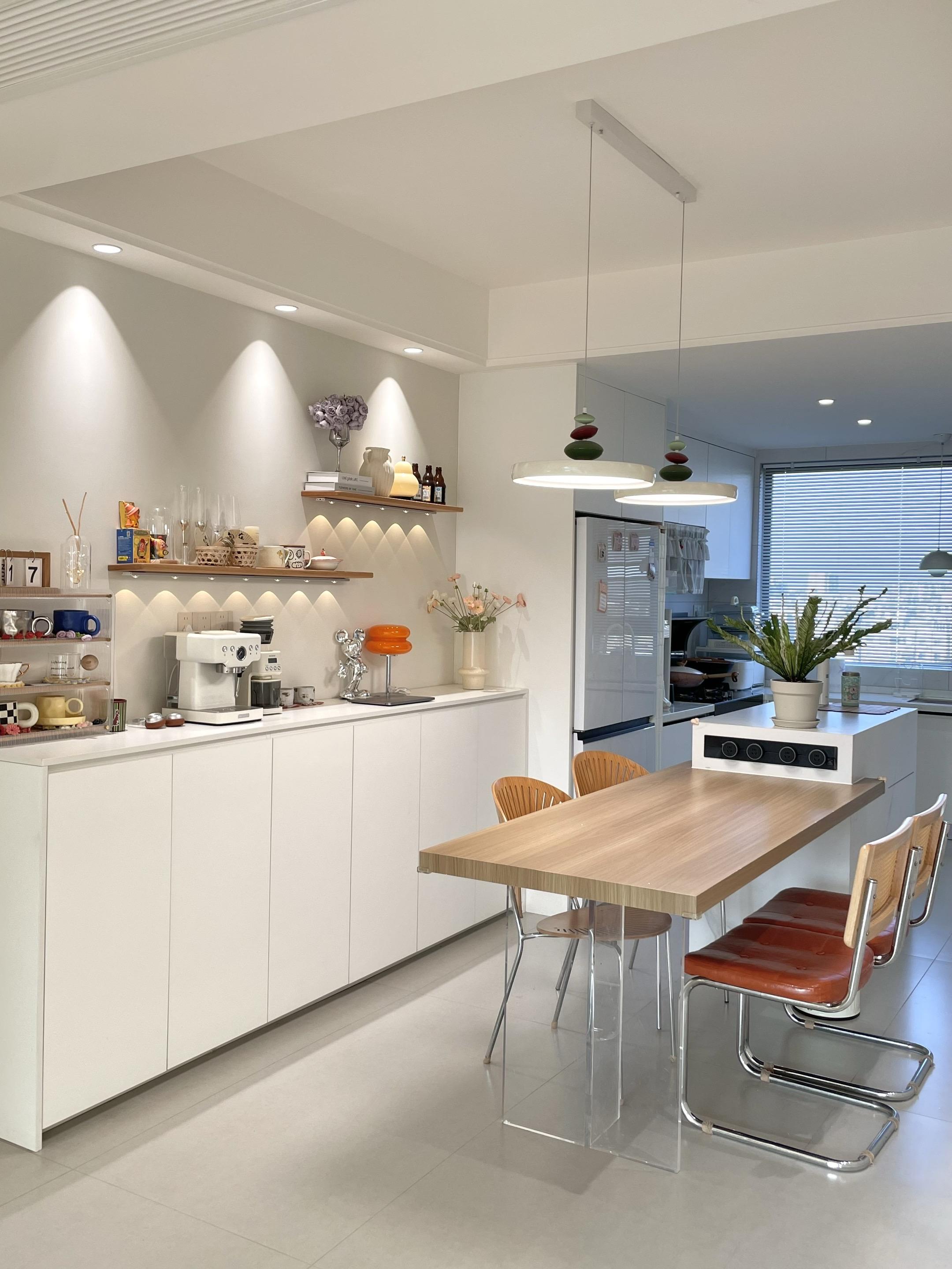 2.7m开间,做岛台餐桌和餐边柜一体设计。巨实用!! 餐厅不大,开间...