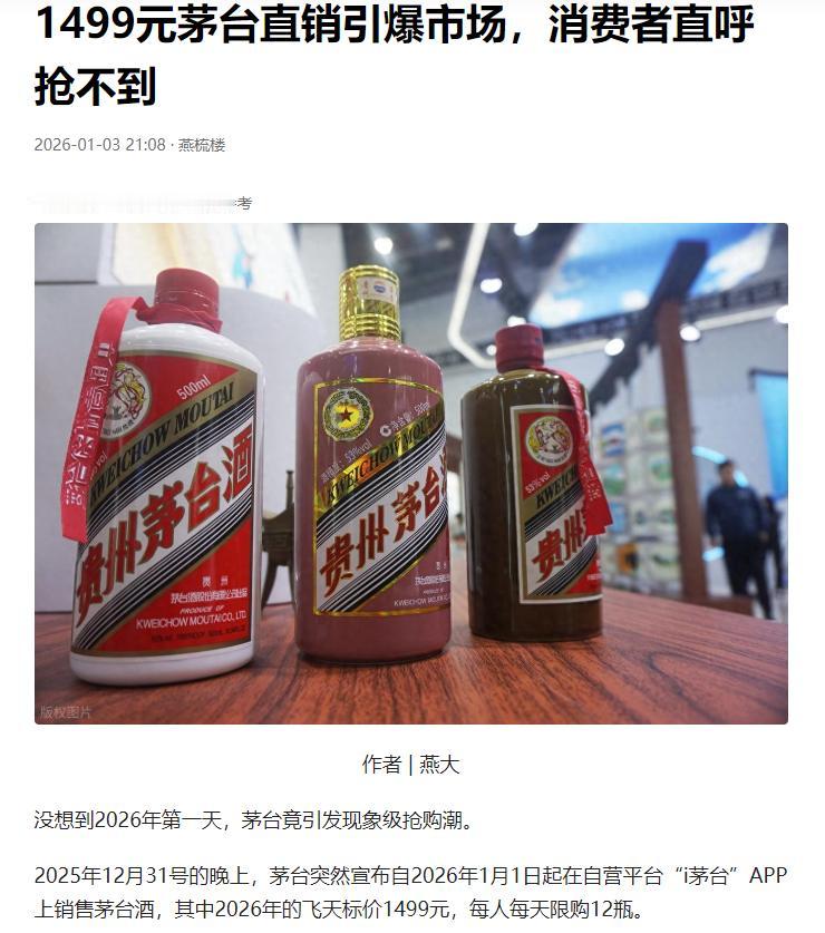 看完整篇关于茅台直销的分析,真的狠狠共情了普通消费者的无奈。 以前 1499 元的飞天茅台永远是 “看得见摸不着” 的纸面价,买瓶酒要被黄牛层层加价收割,那种想入手却被中间商卡脖子的无力感太真实了。 如今茅台掀桌子搞直销,总算把本该属于消费者的公平购买机会和厂家的利润抢了回来。 背后虽有业绩倒逼的现实,但这种打破畸形利益链的操作,还是让人觉得解气又接地气,希望这次能真的让价格回归理性,普通消费者也能少点 “抢不到” 的吐槽。 查看原文链接: