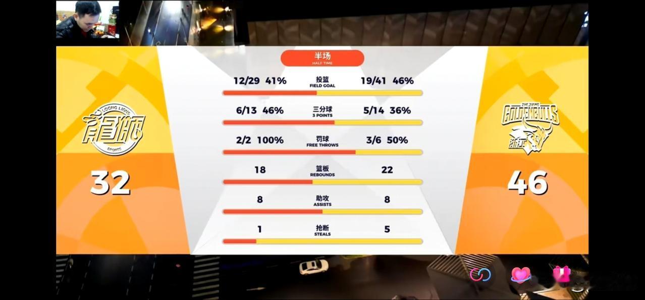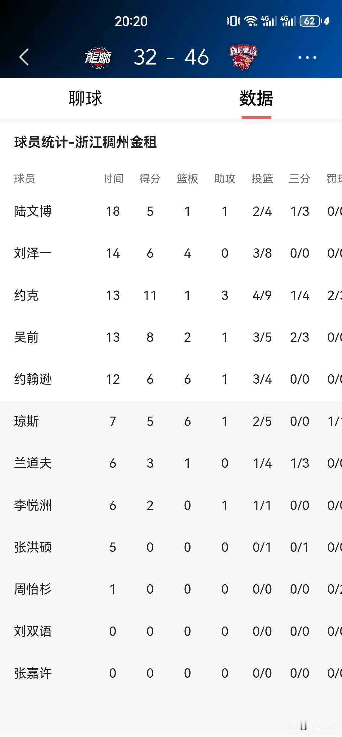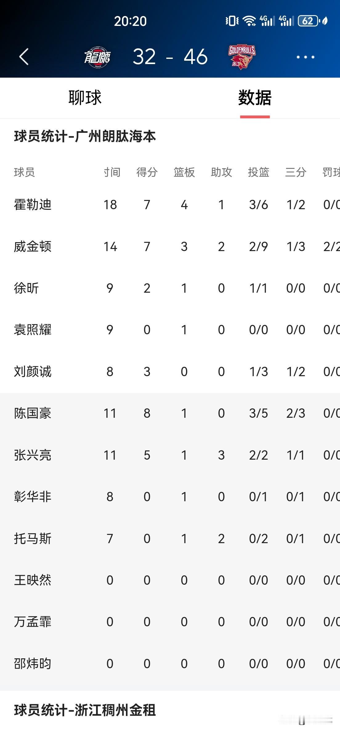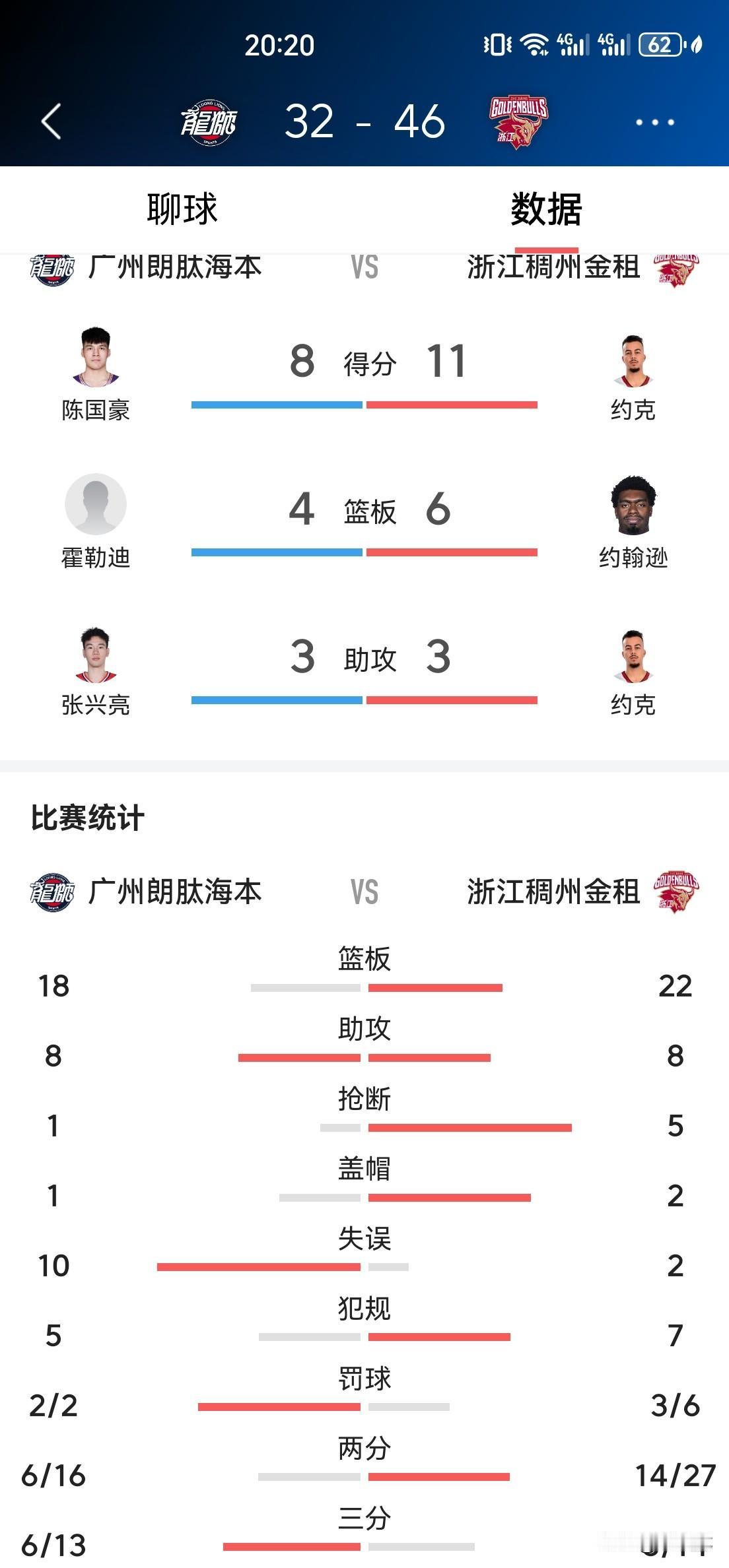 广州队第二节止住颓势,下半场有望逆转翻盘! 半场结束,广州32:46落后14分,第二节19:18净稠州1分。 半场数据分析: 广州队主要输在失误10:2比对手多出8次,被稠州转化为进攻得分;出手投篮次数29:41比对手少12次,刚好的8(失误比差)+4(篮板球比差)=12;命中率41%:46%,三分球出手投篮次数13:14, 投中6:5,命中率46%:36%。 下半场,如果广州队能控制减少失误,加强篮板冲抢,有望实现逆转击败来犯的浙江稠州,为广东宏远老大哥复仇。