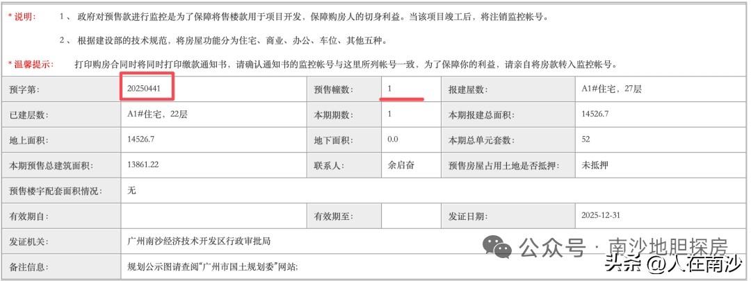南沙壹号果然是冲着顶豪去的,看着外立面竟然是全玻璃幕墙???太敢了吧。 楼盘的预售证也是刚刚拿到手,距离开盘应该不远了。 从预售证可以看到,这次是1号楼的预售证,总高27层,一共52套,层高3.3米。 目前户型图什么都没公布,但是现宣传是190方-266方,因为一号楼最近江边,景色最好。据说是三梯两户设计,私享电梯入户。 也怪不得最近慧谷西区各种概念都出来了,什么 S 府啊,过江缆车啊,超200米高层天际线的啥,提前给南沙壹号预热护航了。我估计接下应该是要给旁边拆好的广隆村搞个概念了。 大家来猜猜南沙壹号会卖多少钱?