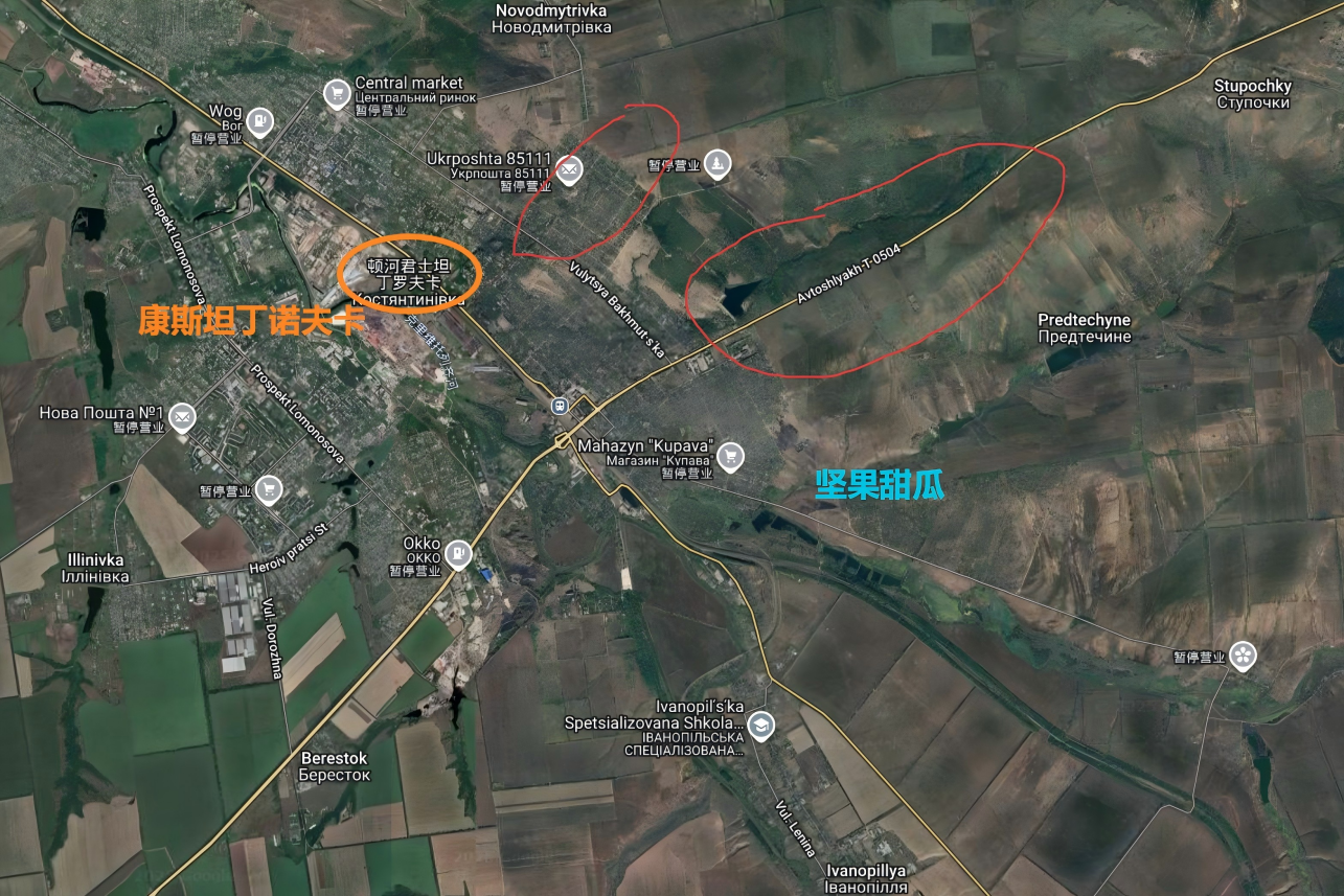 康斯坦丁诺夫卡,南部集群突击队已进入东南角的“化学家”园艺合作社,并且伸出一条触角,要夹击这个农场。可见当地乌军兵力严重不足 ,这么长的触角都没有切断去。