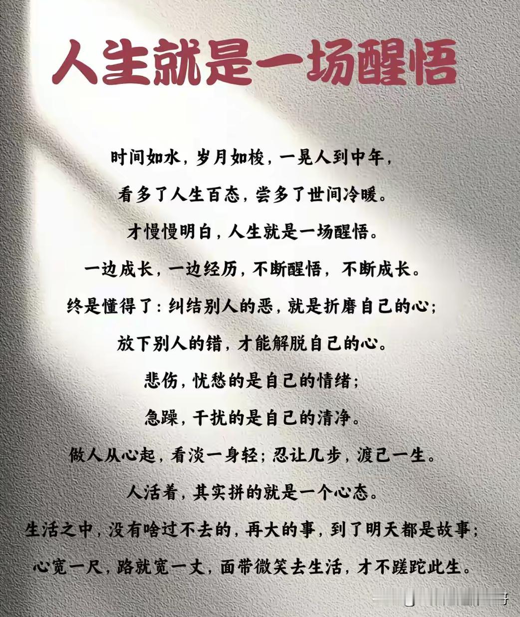 醒悟人生的句子有哪些? 人的末路就是神的开端,心不死则道不生,倘若穷途末路,那便势如破竹! 顺成人,逆成仙,玄妙只在颠倒间。 顺着人性做事,逆着人性做人。 反者道之动,弱者道之用。 成功就是做自己,成功就是做有感觉的事,有感觉地做事,成功就是无时无刻都感觉自己很OK,成功就是把自己的优势发挥到极致。 梦想拉高一分,能量N倍裂变,能量拉高一分,能力N倍裂变。 你若盛开,蝴蝶自来! 中年顿悟语录 瞬间醒悟的句子 心灵深处的醒悟 成长路上的醒悟 五句话瞬间清醒 大彻大悟句子 瞬间醒悟 南墙醒悟文案 人生清醒法则 人性领悟精辟句 人生必知之理 警醒世人的名言 开窍语录 醒悟之人 大彻大悟金句 开悟精辟句子 人间醒悟瞬间 晚年醒悟 生命尽头的醒悟 狠道语录 醒悟之路 顿悟句子