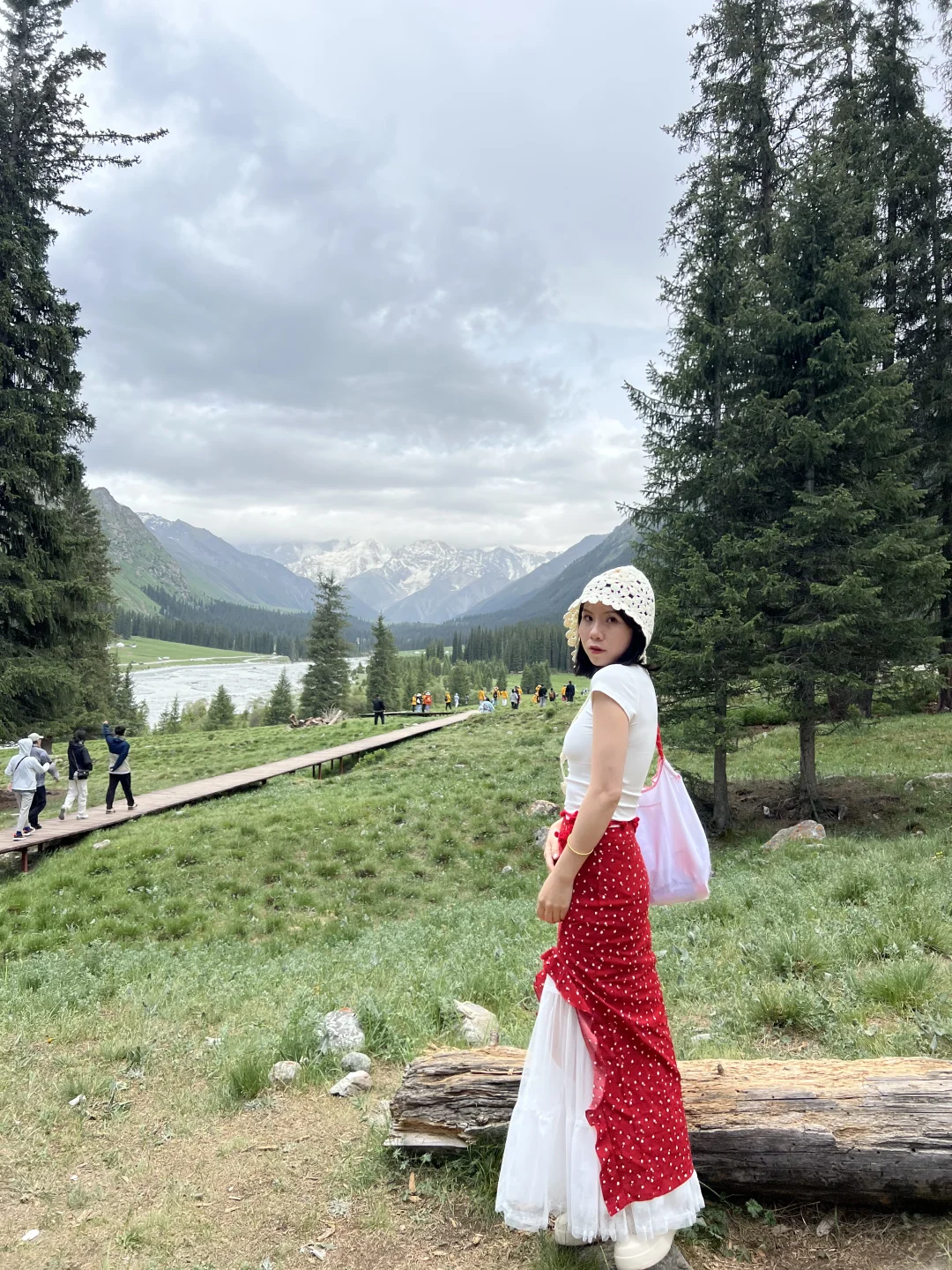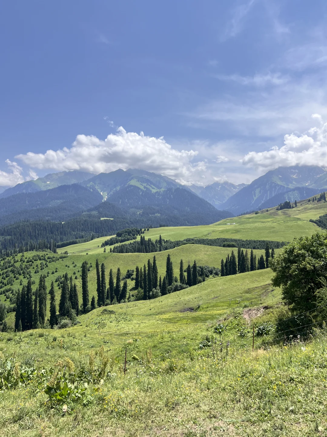 Day2:开车从伊宁经过伊昭公路,这个公路沿途风景还可以吧,然后直接开了几个小时夏塔(图2-3),实话说很震撼,但是那天我们到的时候天气不够好,如果天气好真的是很美很美,森林环绕着雪山🏔️太美啦!记得穿外套,然后我们往回走的时候还碰到双彩虹!!