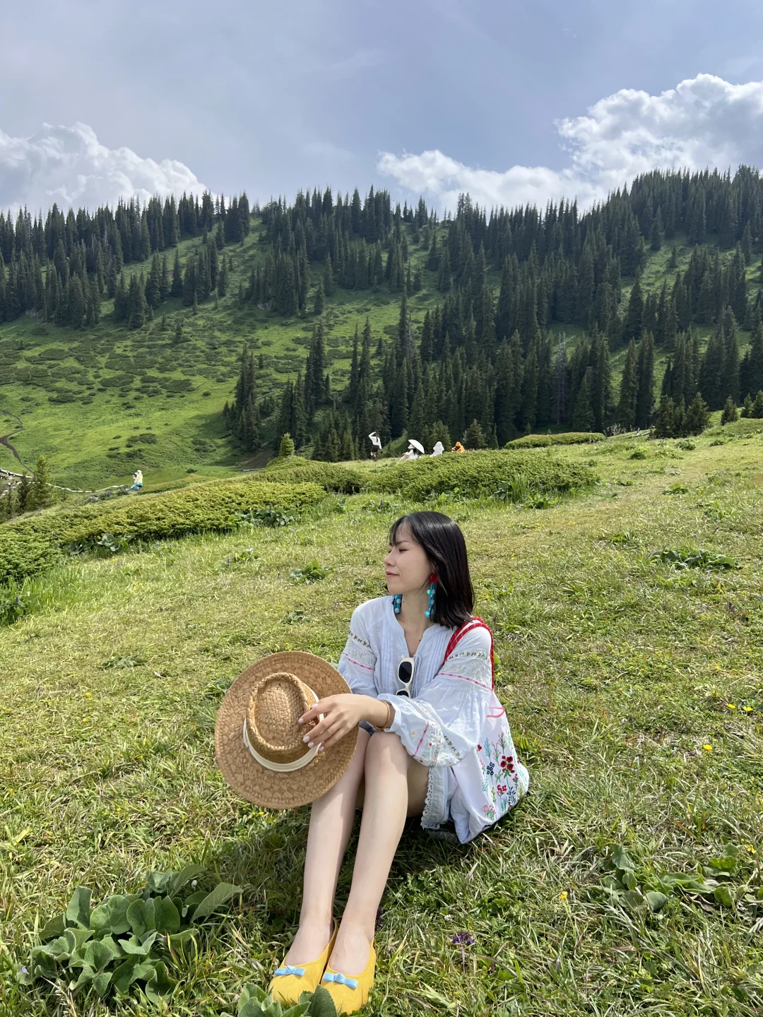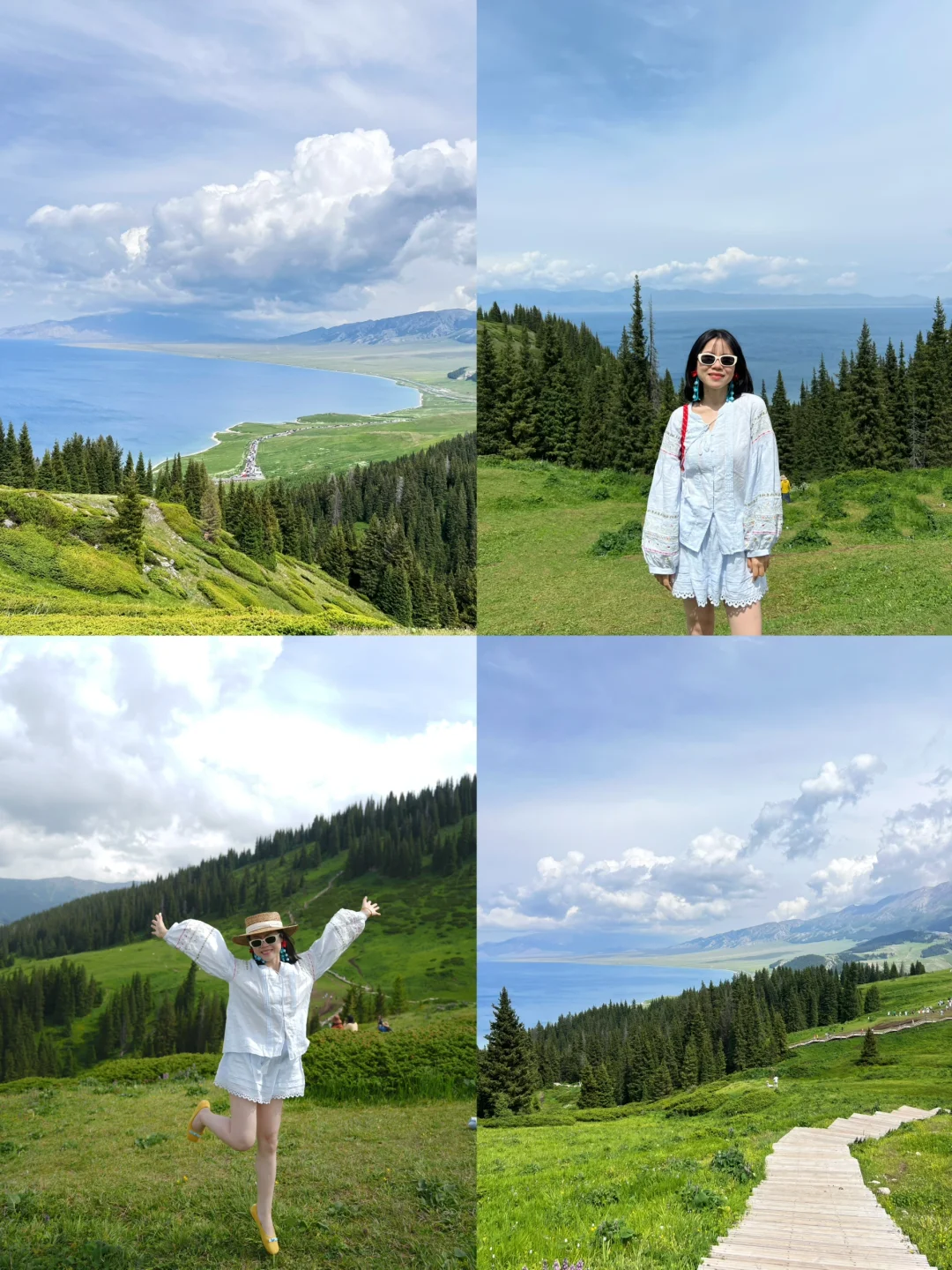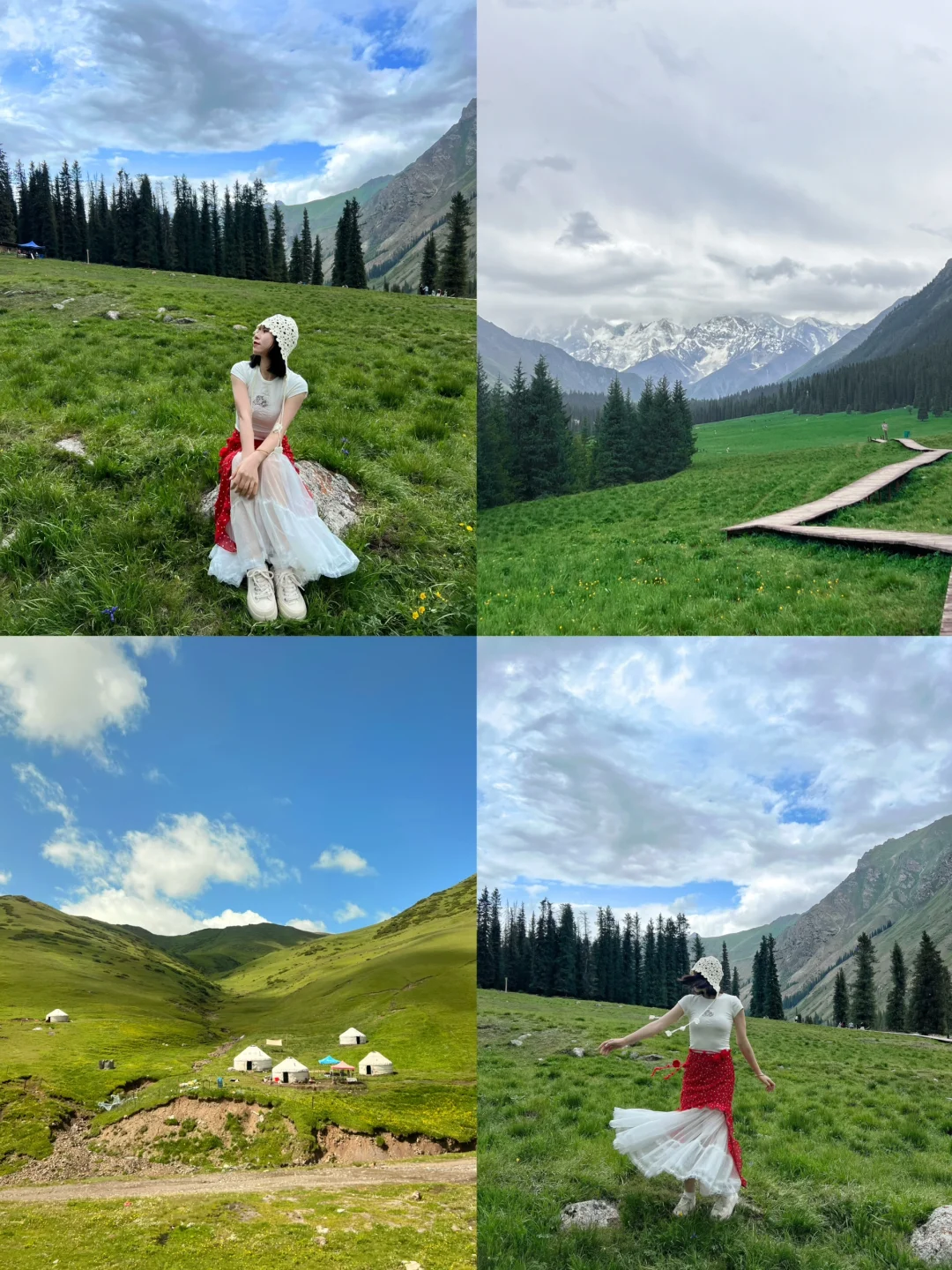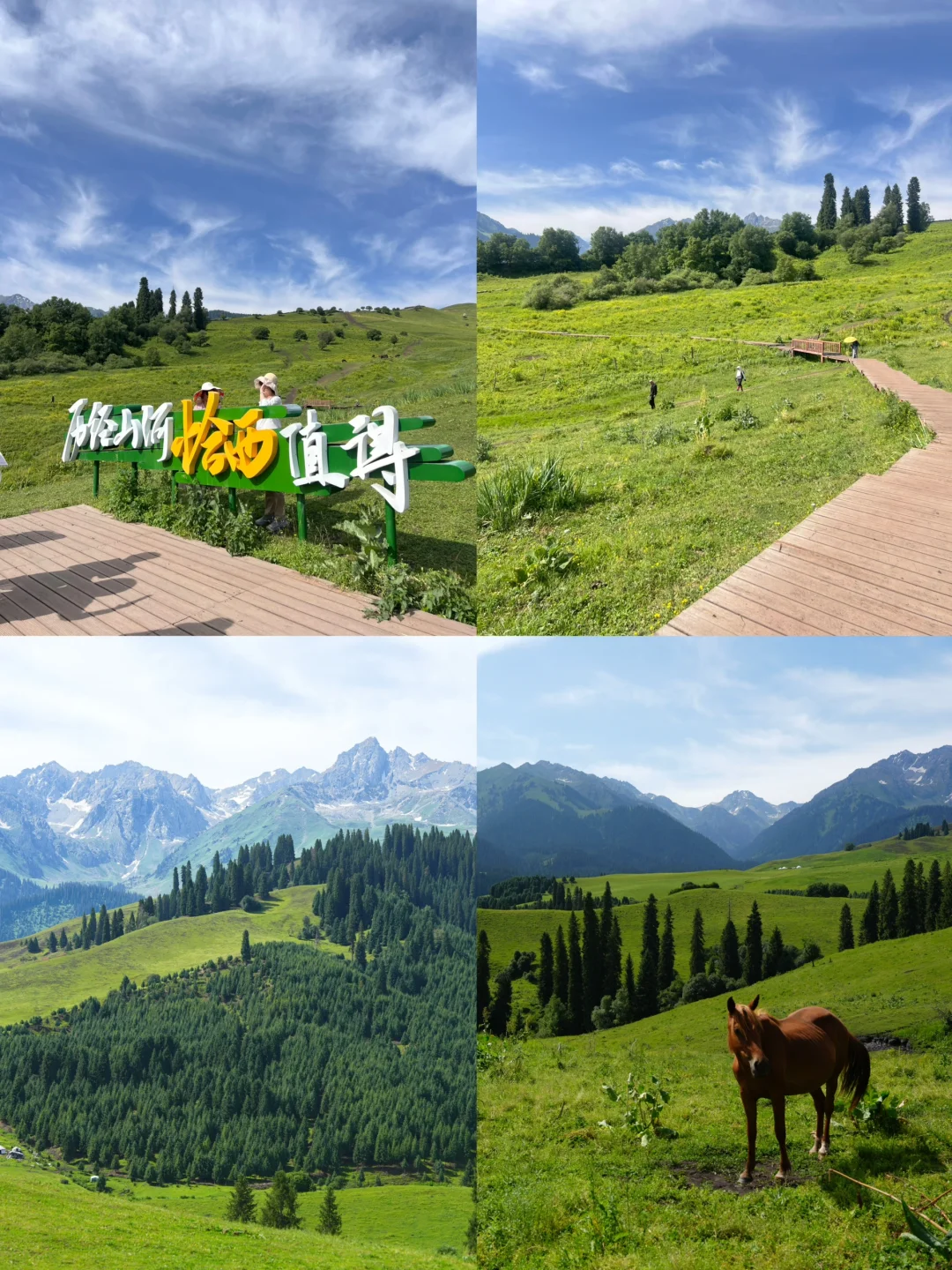 Day4:开车到恰西森林公园,这个我超级爱,徒步栈道,走了40分钟,慢悠悠上去,风景超级美!!难怪说是藏在画卷里的草原,我们也碰到了好天气,抱了小🐑,10元一次,我在这里拍了旱地拔葱!198一条视频,两个人是268,拍的还可以吧[偷笑R],这里我觉得很值得去(图7-9)